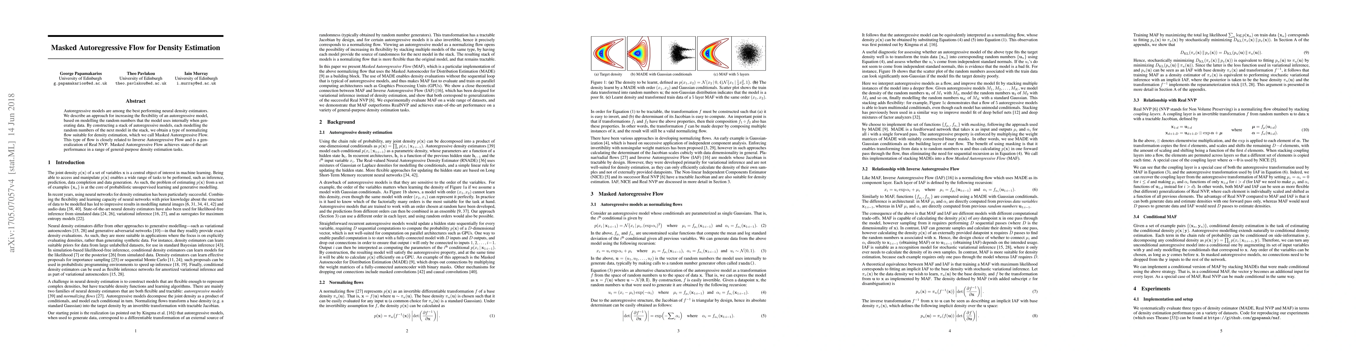 This paper introduces Masked Autoregressive Flow, a novel density estimation method that stacks autoregressive models to model the random numbers used internally, achieving state-of-the-art performance in general-purpose density estimation tasks.