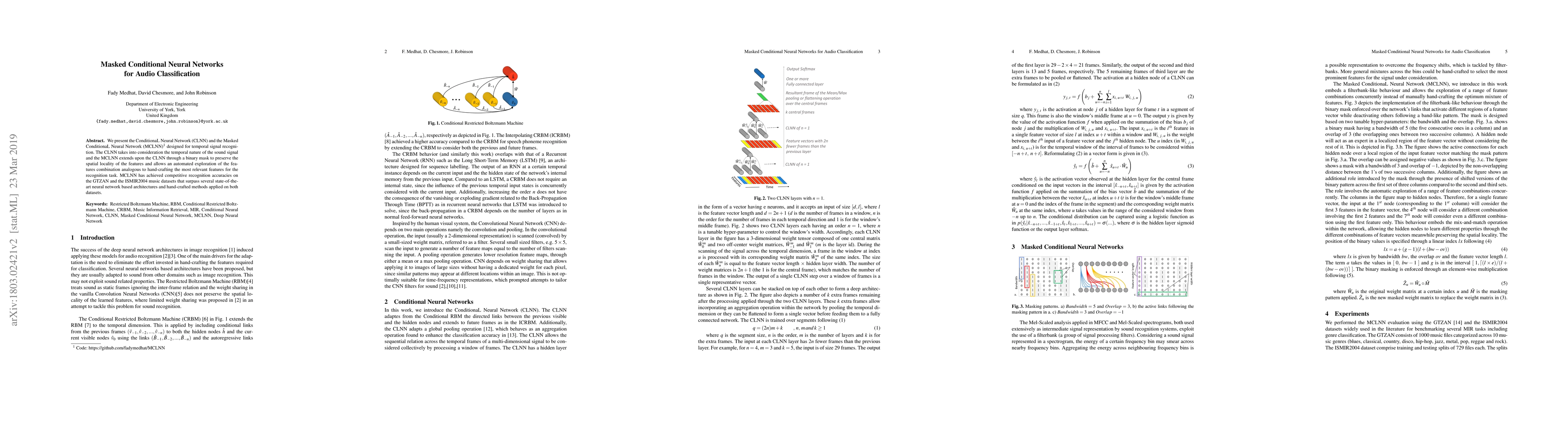 The paper introduces the Conditional Neural Network (CLNN) and its masked variant (MCLNN) for audio classification, achieving competitive recognition accuracies on music datasets. The MCLNN uses a binary mask to enhance spatial locality and feature combination, outperforming state-of-the-art neural networks and hand-crafted methods.