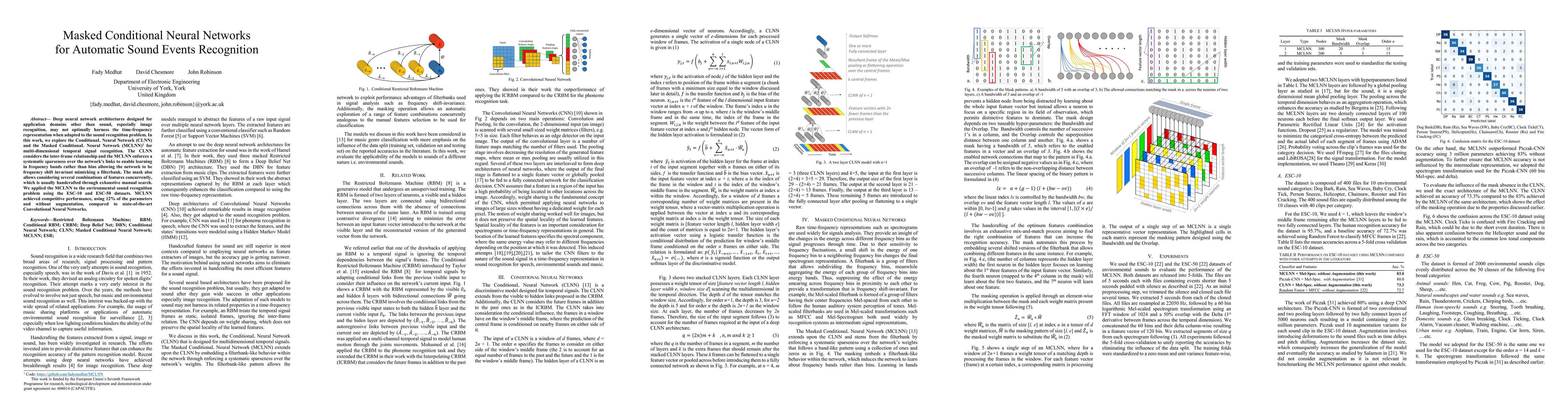 This paper proposes the Masked Conditional Neural Network (MCLNN) for automatic sound event recognition, achieving competitive performance with fewer parameters compared to state-of-the-art Convolutional Neural Networks. The MCLNN enforces sparseness and frequency shift invariance, enabling effective learning from frequency bands.