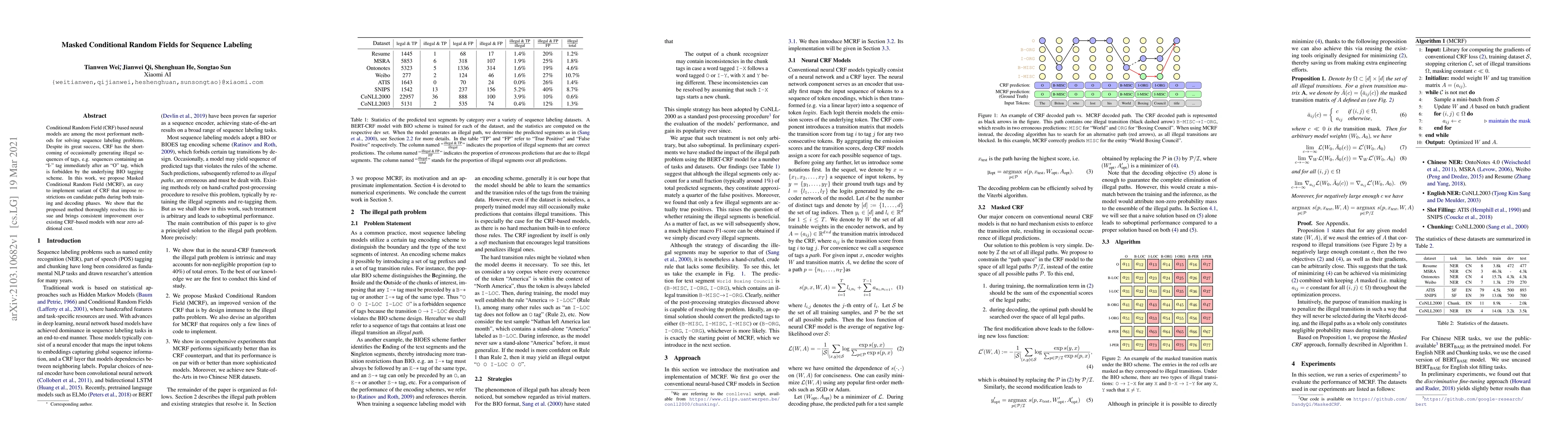 This paper proposes Masked Conditional Random Fields (MCRF) to improve sequence labeling by preventing illegal tag sequences in CRF models, achieving consistent performance gains with minimal additional computational cost. The MCRF method imposes restrictions during both training and decoding to adhere to the BIO tagging scheme.
