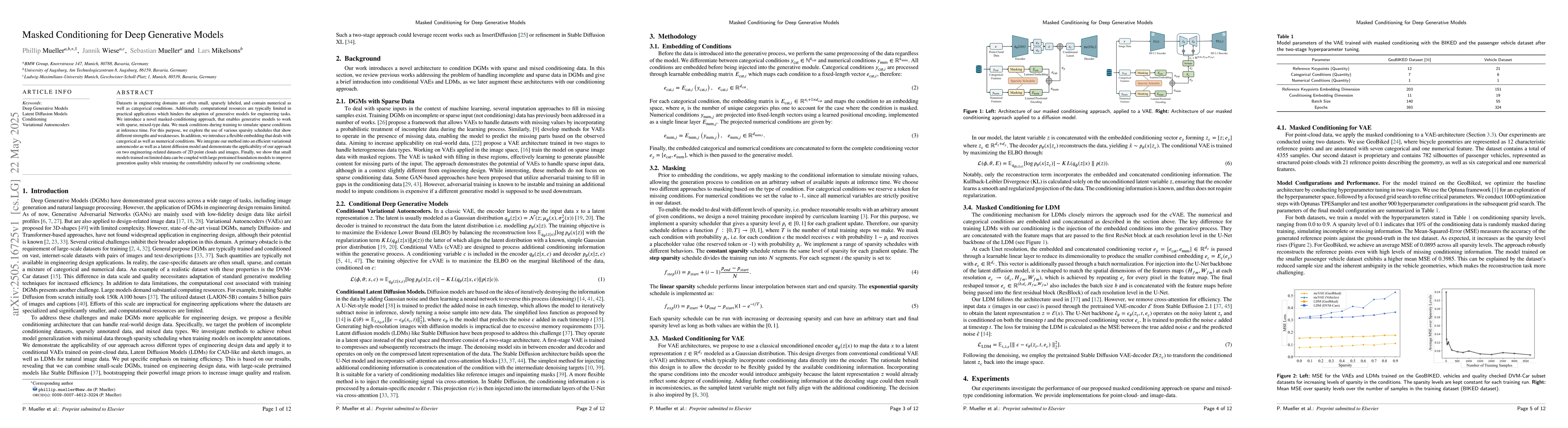 Datasets in engineering domains are often small, sparsely labeled, and contain numerical as well as categorical conditions. Additionally. computational resources are typically limited in practical applications which hinders the adoption of generative models for engineering tasks. We introduce a novel masked-conditioning approach, that enables generative models to work with sparse, mixed-type data. We mask conditions during training to simulate sparse conditions at inference time. For this purpose, we explore the use of various sparsity schedules that show different strengths and weaknesses. In addition, we introduce a flexible embedding that deals with categorical as well as numerical conditions. We integrate our method into an efficient variational autoencoder as well as a latent diffusion model and demonstrate the applicability of our approach on two engineering-related datasets of 2D point clouds and images. Finally, we show that small models trained on limited data can be coupled with large pretrained foundation models to improve generation quality while retaining the controllability induced by our conditioning scheme.