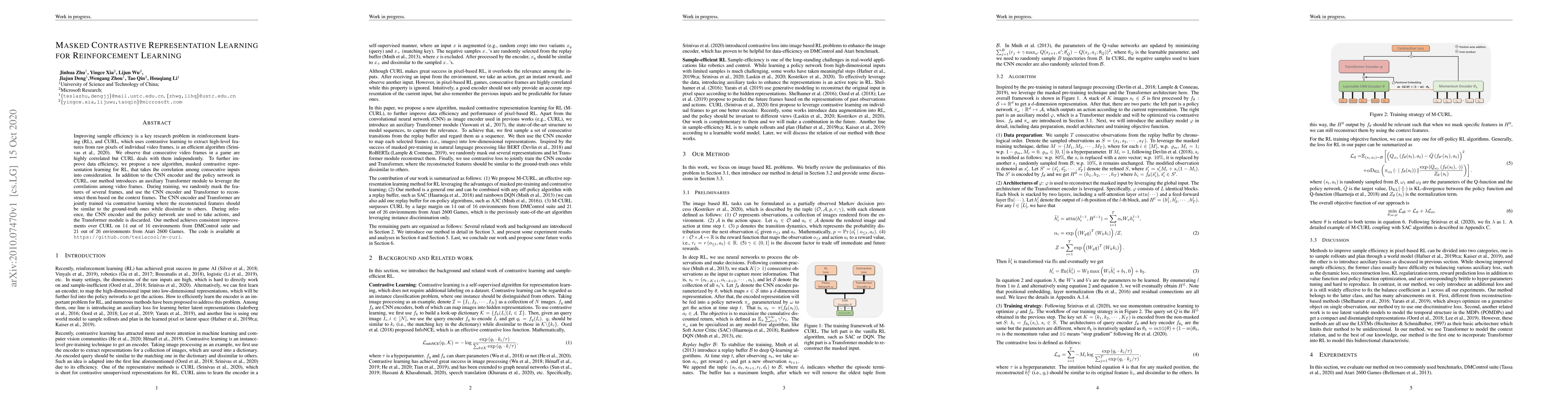 This paper proposes a new masked contrastive representation learning algorithm for reinforcement learning that improves data efficiency by leveraging correlations between consecutive video frames. It introduces an auxiliary Transformer module to enhance the CNN encoder and policy network, achieving consistent improvements over CURL on various environments from DMControl and Atari 2600 Games.