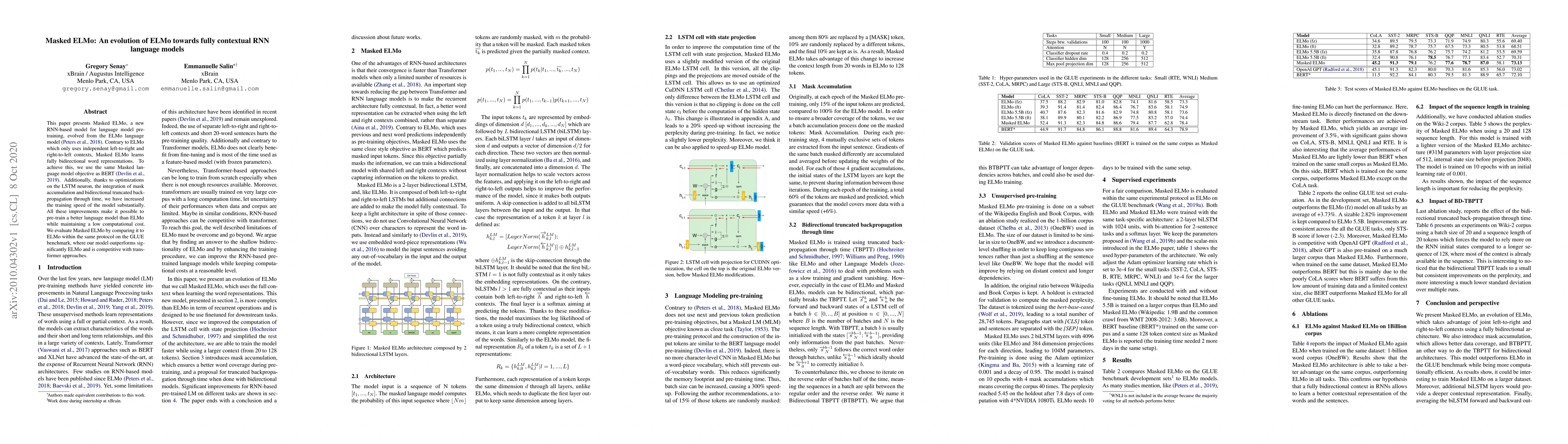 The paper introduces Masked ELMo, an advanced RNN-based language model pre-training method derived from ELMo. It uses a bidirectional context similar to BERT, improving word representation learning. Enhancements like optimized LSTM neuron use and efficient backpropagation methods boost training speed. Masked ELMo surpasses ELMo's performance on the GLUE benchmark, demonstrating competitive results with transformer models, all while maintaining lower computational costs.