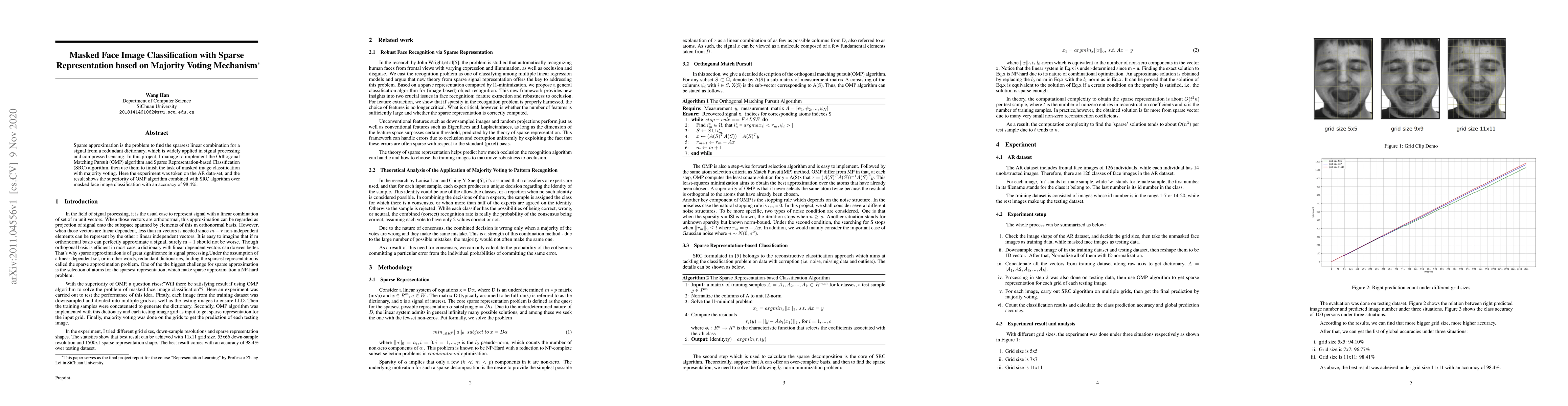 Sparse approximation is the problem to find the sparsest linear combination for a signal from a redundant dictionary, which is widely applied in signal processing and compressed sensing. In this project, I manage to implement the Orthogonal Matching Pursuit (OMP) algorithm and Sparse Representation-based Classification (SRC) algorithm, then use them to finish the task of masked image classification with majority voting. Here the experiment was token on the AR data-set, and the result shows the superiority of OMP algorithm combined with SRC algorithm over masked face image classification with an accuracy of 98.4%.