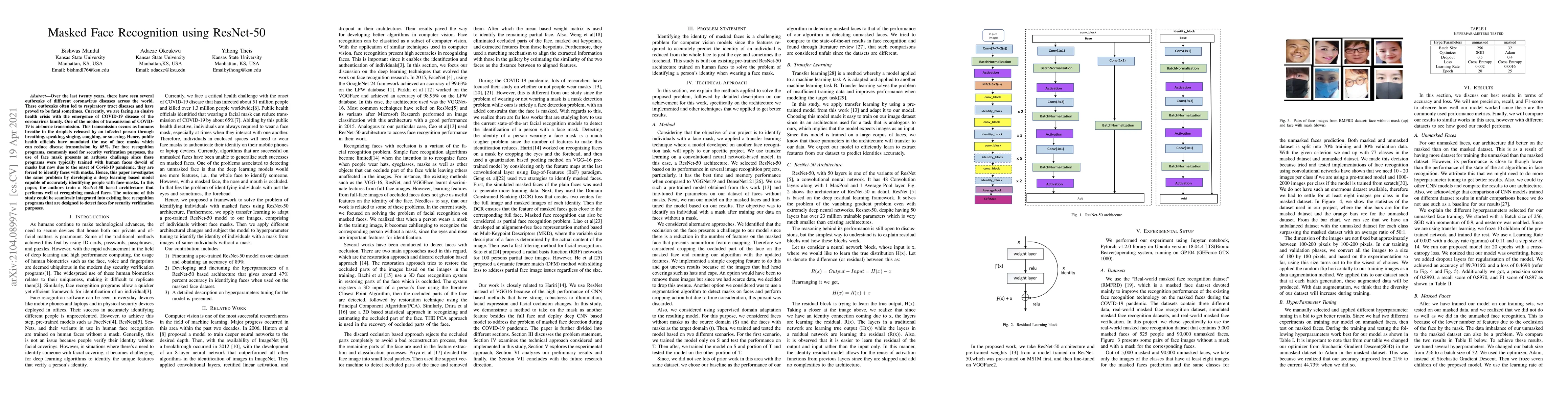 The paper presents a fine-tuned ResNet-50 model for masked face recognition, demonstrating its effectiveness with a real-world masked face dataset.