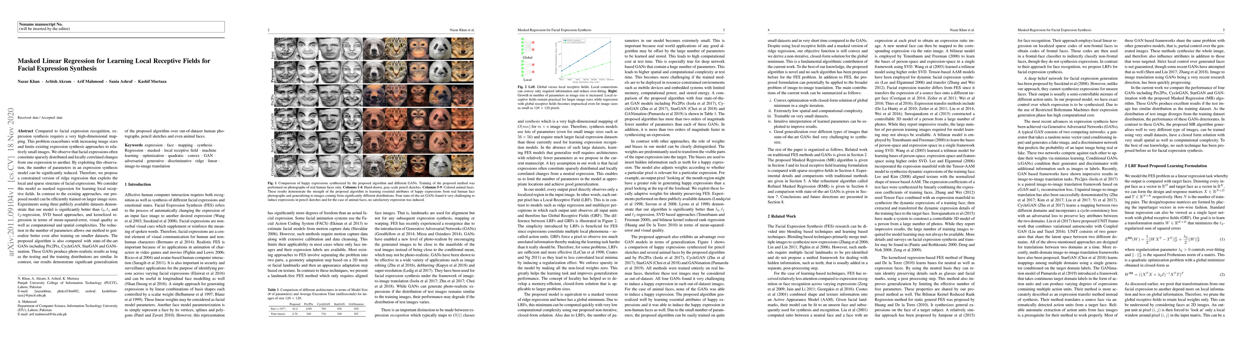 Compared to facial expression recognition, expression synthesis requires a very high-dimensional mapping. This problem exacerbates with increasing image sizes and limits existing expression synthesis approaches to relatively small images. We observe that facial expressions often constitute sparsely distributed and locally correlated changes from one expression to another. By exploiting this observation, the number of parameters in an expression synthesis model can be significantly reduced. Therefore, we propose a constrained version of ridge regression that exploits the local and sparse structure of facial expressions. We consider this model as masked regression for learning local receptive fields. In contrast to the existing approaches, our proposed model can be efficiently trained on larger image sizes. Experiments using three publicly available datasets demonstrate that our model is significantly better than $\ell_0, \ell_1$ and $\ell_2$-regression, SVD based approaches, and kernelized regression in terms of mean-squared-error, visual quality as well as computational and spatial complexities. The reduction in the number of parameters allows our method to generalize better even after training on smaller datasets. The proposed algorithm is also compared with state-of-the-art GANs including Pix2Pix, CycleGAN, StarGAN and GANimation. These GANs produce photo-realistic results as long as the testing and the training distributions are similar. In contrast, our results demonstrate significant generalization of the proposed algorithm over out-of-dataset human photographs, pencil sketches and even animal faces.