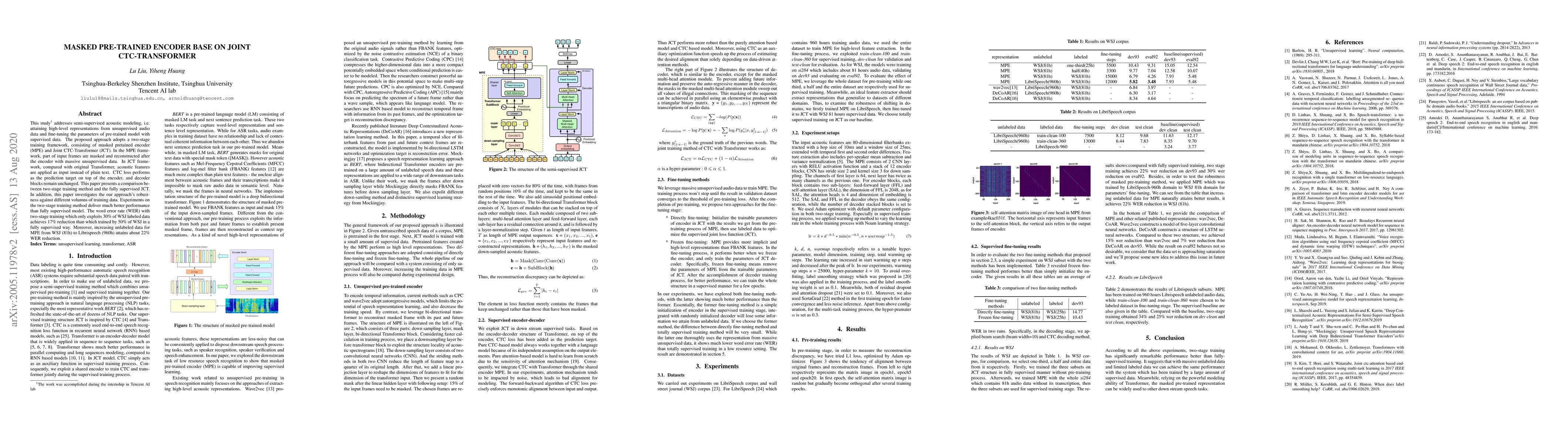 This study (The work was accomplished during the internship in Tencent AI lab) addresses semi-supervised acoustic modeling, i.e. attaining high-level representations from unsupervised audio data and fine-tuning the parameters of pre-trained model with supervised data. The proposed approach adopts a two-stage training framework, consisting of masked pre-trained encoder (MPE) and Joint CTC-Transformer (JCT). In the MPE framework, part of input frames are masked and reconstructed after the encoder with massive unsupervised data. In JCT framework, compared with original Transformer, acoustic features are applied as input instead of plain text. CTC loss performs as the prediction target on top of the encoder, and decoder blocks remain unchanged. This paper presents a comparison between two-stage training method and the fully supervised JCT. In addition, this paper investigates the our approach's robustness against different volumns of training data. Experiments on the two-stage training method deliver much better performance than fully supervised model. The word error rate (WER) with two-stage training which only exploits 30\% of WSJ labeled data achieves 17\% reduction than which trained by 50\% of WSJ in a fully supervised way. Moreover, increasing unlabeled data for MPE from WSJ (81h) to Librispeech (960h) attains about 22\% WER reduction.