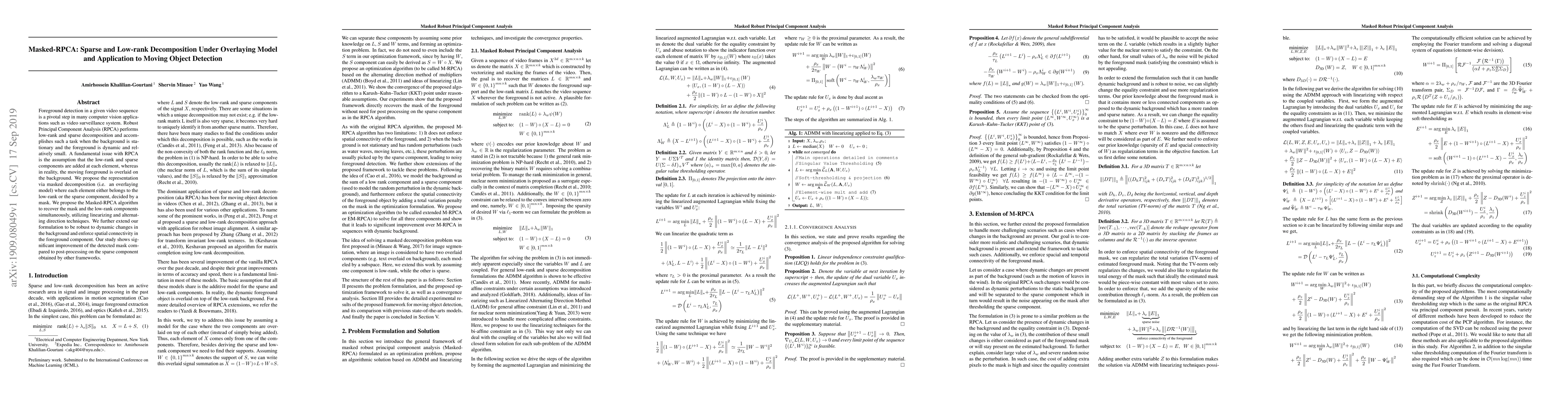 The Masked-RPCA algorithm decomposes video sequences into low-rank and sparse components using an overlaying model, improving foreground detection by recovering the mask and low-rank components simultaneously. This approach outperforms traditional RPCA methods in detecting dynamic foreground objects against changing backgrounds.
