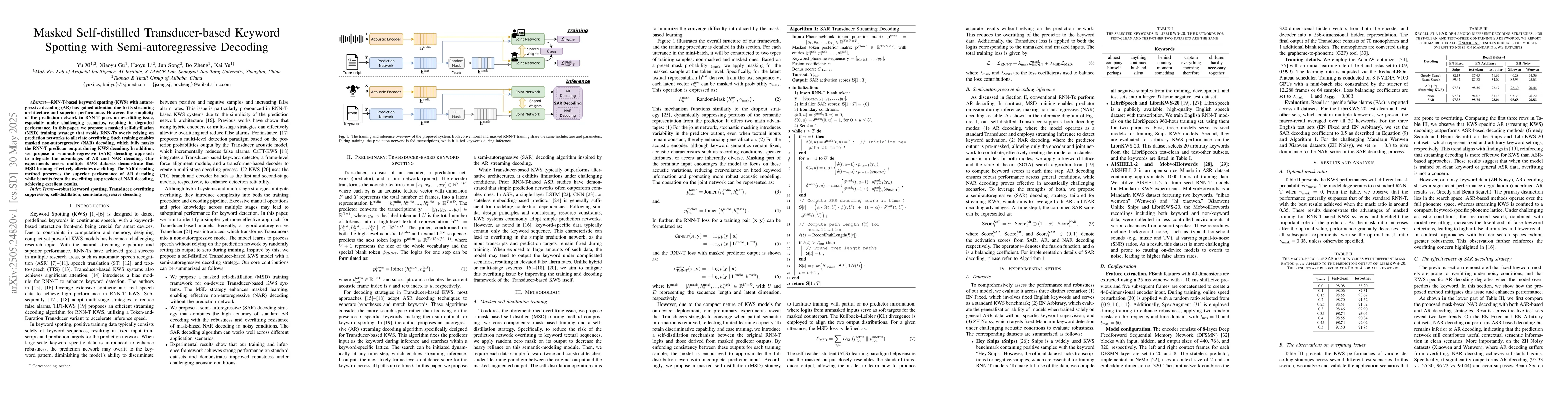 The introduction of masked self-distillation (MSD) training strategy and semi-autoregressive (SAR) decoding method for RNN-T-based KWS systems.