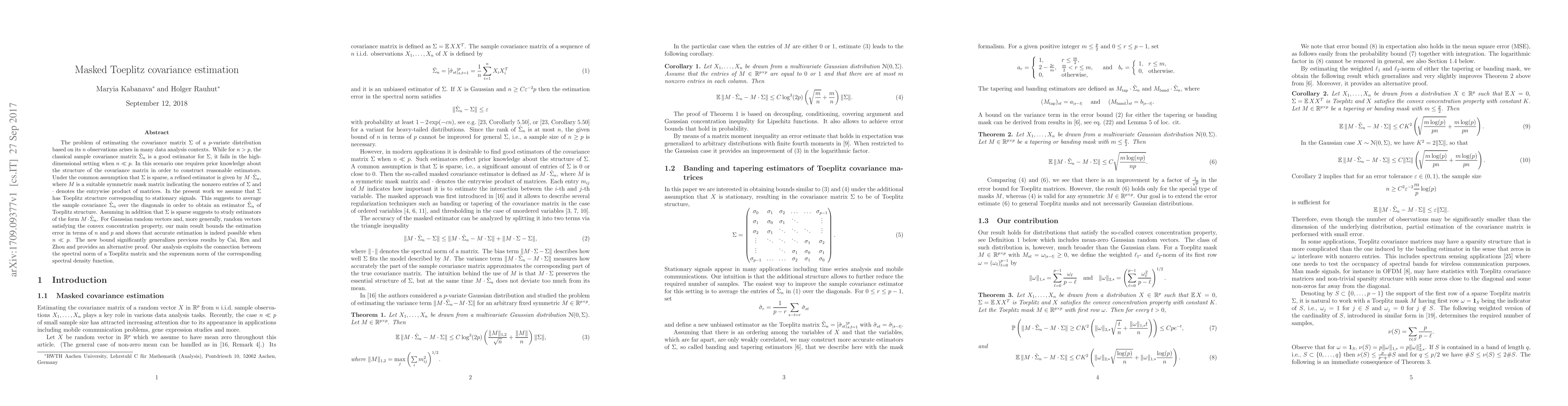 The problem of estimating the covariance matrix $\Sigma$ of a $p$-variate distribution based on its $n$ observations arises in many data analysis contexts. While for $n>p$, the classical sample covariance matrix $\hat{\Sigma}_n$ is a good estimator for $\Sigma$, it fails in the high-dimensional setting when $n\ll p$. In this scenario one requires prior knowledge about the structure of the covariance matrix in order to construct reasonable estimators. Under the common assumption that $\Sigma$ is sparse, a refined estimator is given by $M\cdot\hat{\Sigma}_n$, where $M$ is a suitable symmetric mask matrix indicating the nonzero entries of $\Sigma$ and $\cdot$ denotes the entrywise product of matrices. In the present work we assume that $\Sigma$ has Toeplitz structure corresponding to stationary signals. This suggests to average the sample covariance $\hat{\Sigma}_n$ over the diagonals in order to obtain an estimator $\tilde{\Sigma}_n$ of Toeplitz structure. Assuming in addition that $\Sigma$ is sparse suggests to study estimators of the form $M\cdot\tilde{\Sigma}_n$. For Gaussian random vectors and, more generally, random vectors satisfying the convex concentration property, our main result bounds the estimation error in terms of $n$ and $p$ and shows that accurate estimation is indeed possible when $n \ll p$. The new bound significantly generalizes previous results by Cai, Ren and Zhou and provides an alternative proof. Our analysis exploits the connection between the spectral norm of a Toeplitz matrix and the supremum norm of the corresponding spectral density function.