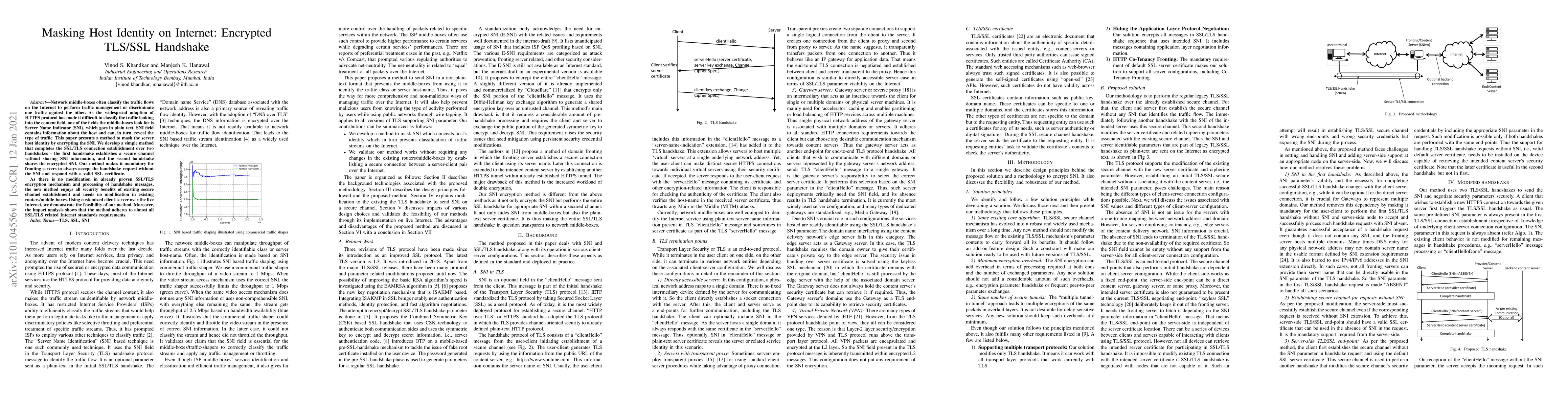 This paper proposes a method to mask server host identity during HTTPS traffic by encrypting the Server Name Indicator (SNI) field, which is typically sent in plain text. The method involves two SSL/TLS handshakes: the first establishes a secure channel without sharing SNI, and the second shares the encrypted SNI. This approach maintains existing SSL/TLS security benefits and does not require modifications to routers or middle-boxes.