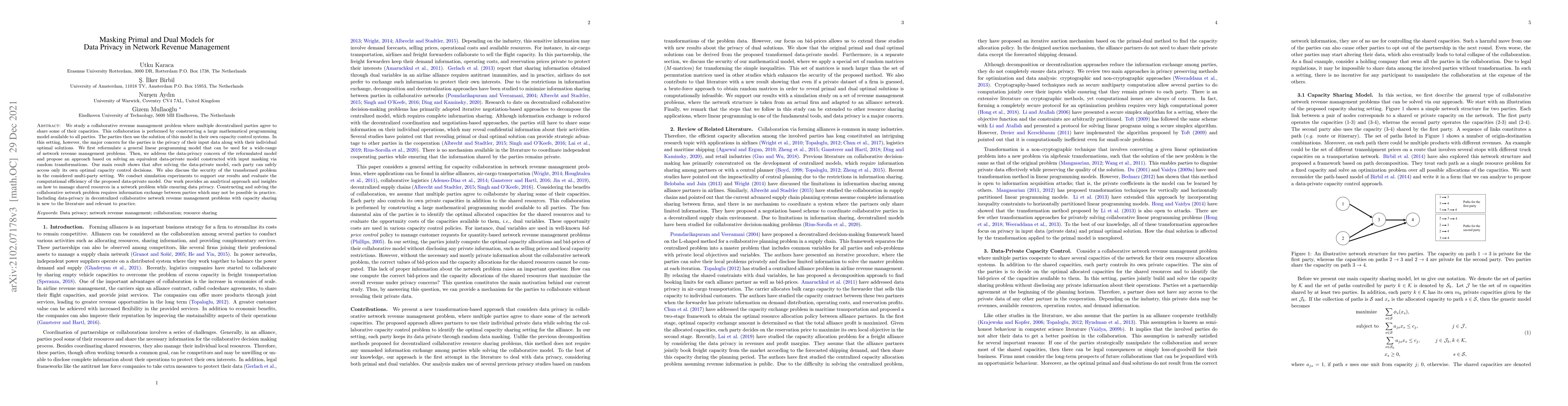 This paper proposes a method to collaboratively manage network revenue while ensuring data privacy for decentralized parties sharing capacities. It reformulates a general linear programming model and introduces a masking technique to solve an equivalent data-private model, thereby allowing each party to access only its own optimal decisions without compromising privacy.