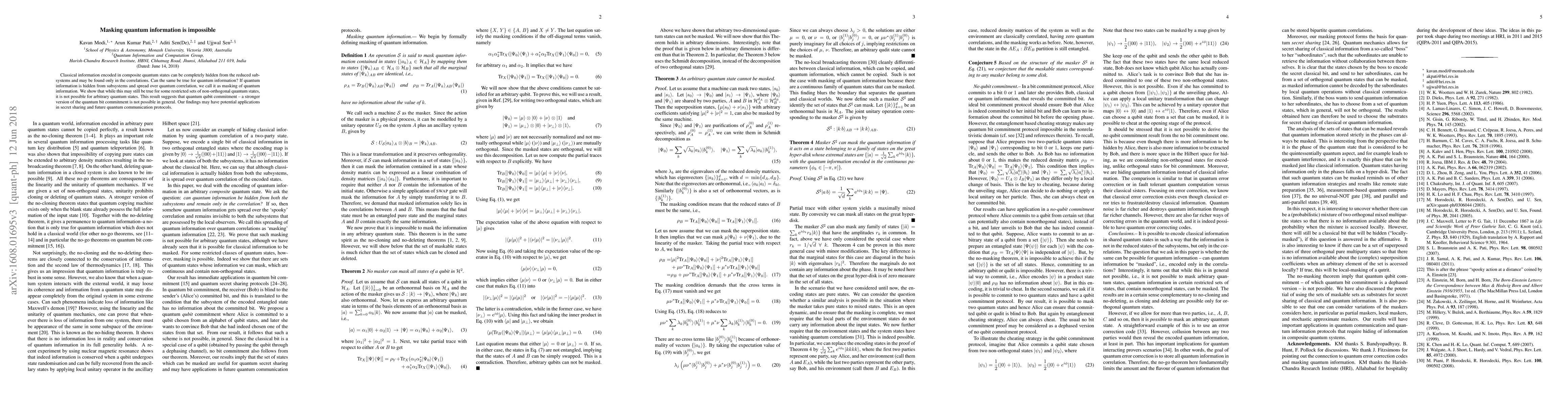 Researchers found that masking quantum information, where a quantum state hides its quantum properties from subsystems, is impossible for arbitrary states. This challenges the possibility of quantum bit commitment.