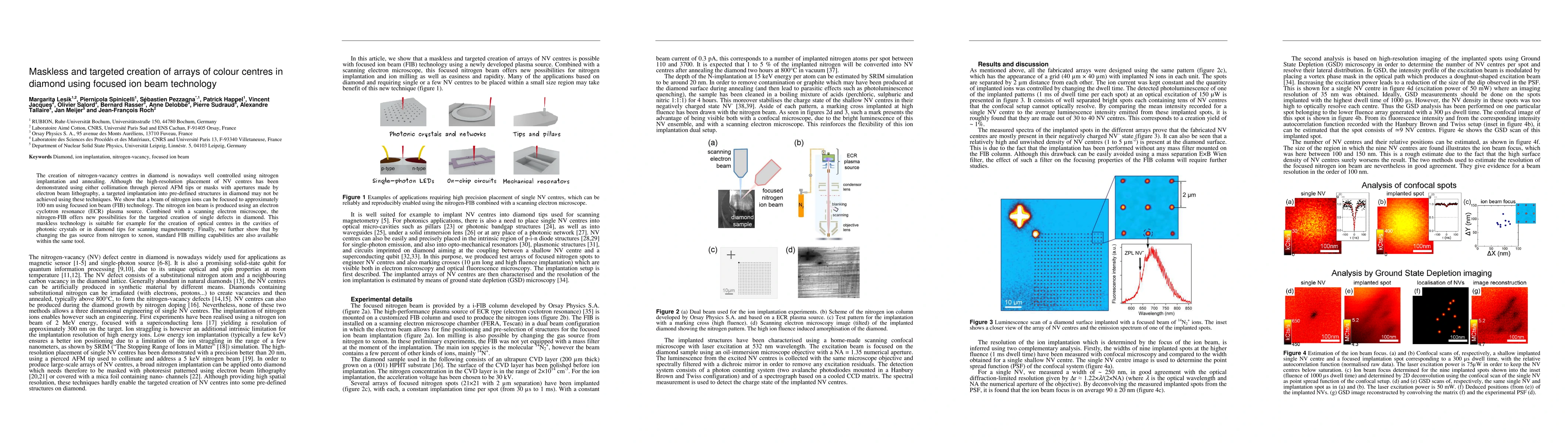 This paper demonstrates the use of focused ion beam (FIB) technology to create arrays of nitrogen-vacancy centres in diamond without the need for masks, enabling precise placement of optical centres in photonic crystal cavities or for scanning magnetometry. The method utilizes an electron cyclotron resonance plasma source to achieve a nitrogen ion beam with a resolution of approximately 100 nm.