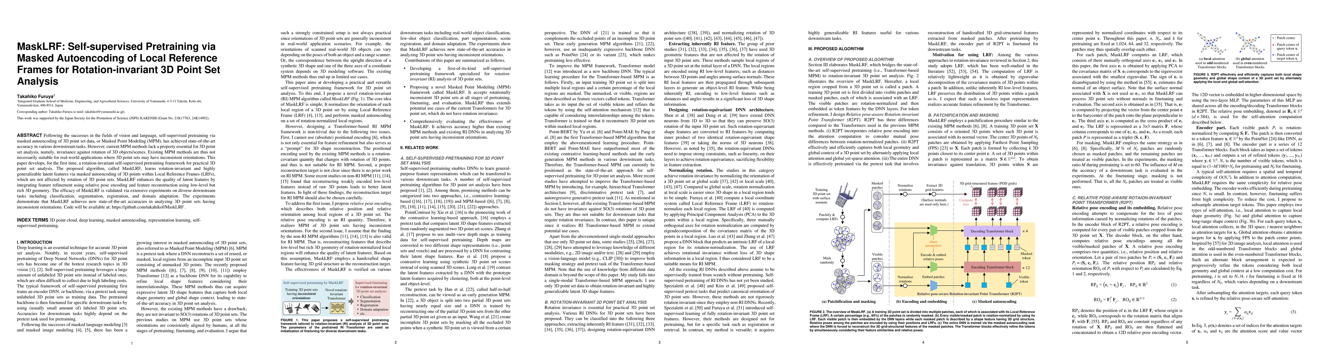 The paper introduces MaskLRF, a self-supervised pretraining method that uses masked autoencoding of 3D point sets within Local Reference Frames to achieve rotation-invariant features. This approach improves performance on various 3D point set analysis tasks, outperforming existing methods by achieving state-of-the-art accuracy.