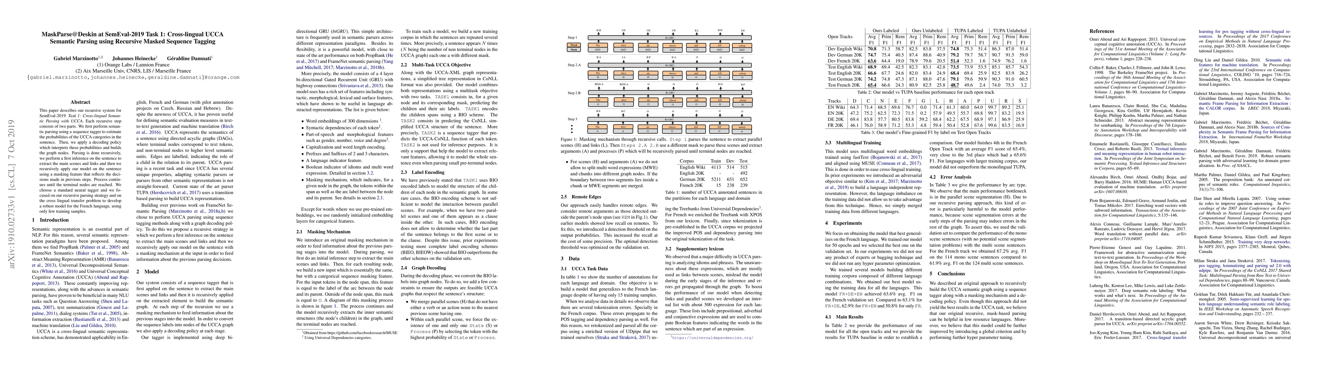 This paper describes our recursive system for SemEval-2019 \textit{ Task 1: Cross-lingual Semantic Parsing with UCCA}. Each recursive step consists of two parts. We first perform semantic parsing using a sequence tagger to estimate the probabilities of the UCCA categories in the sentence. Then, we apply a decoding policy which interprets these probabilities and builds the graph nodes. Parsing is done recursively, we perform a first inference on the sentence to extract the main scenes and links and then we recursively apply our model on the sentence using a masking feature that reflects the decisions made in previous steps. Process continues until the terminal nodes are reached. We choose a standard neural tagger and we focused on our recursive parsing strategy and on the cross lingual transfer problem to develop a robust model for the French language, using only few training samples.