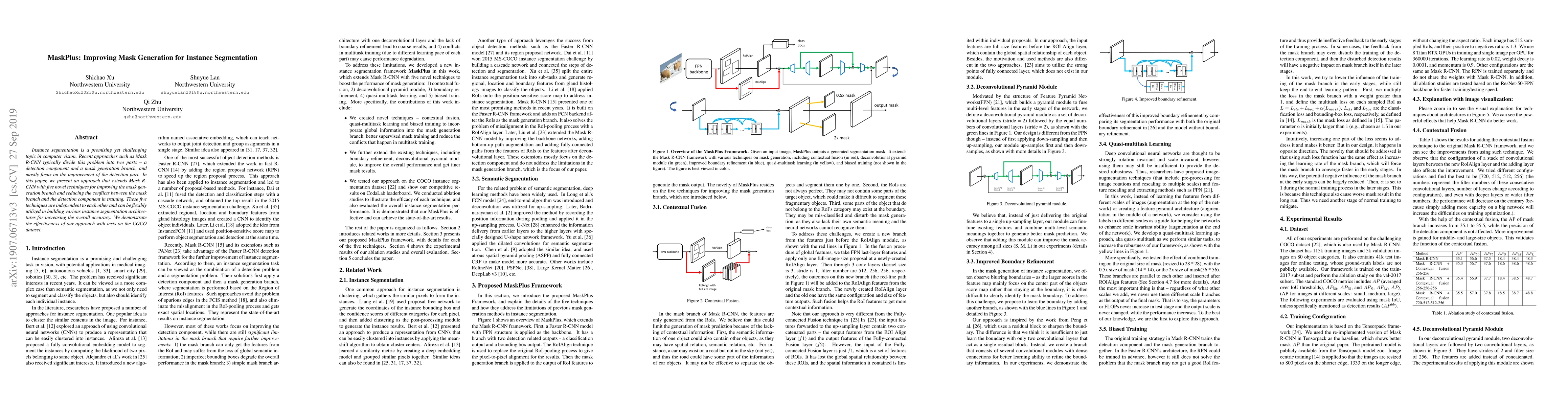 The paper introduces MaskPlus, an extension to Mask R-CNN that enhances the mask generation branch for instance segmentation. MaskPlus employs five novel optimization techniques to reduce conflicts with the detection component, improving overall accuracy on the COCO dataset.