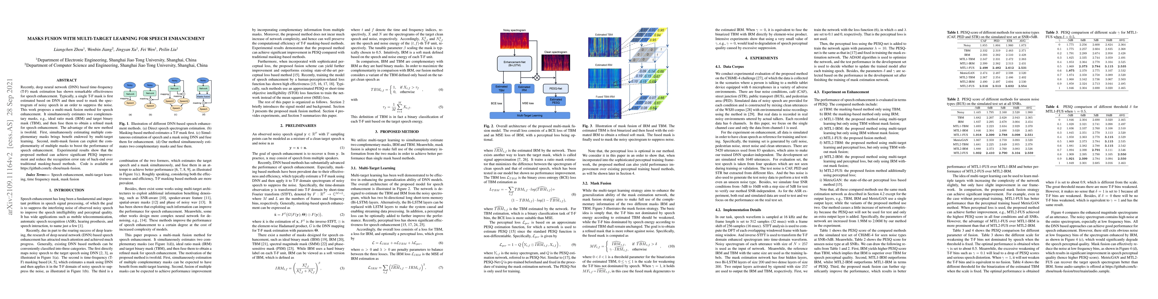 This paper proposes a multi-mask fusion method for speech enhancement using deep neural networks, which estimates two complementary masks simultaneously to refine the mask and improve performance. The method achieves better PESQ scores and lower recognition error rates compared to traditional masking-based methods.