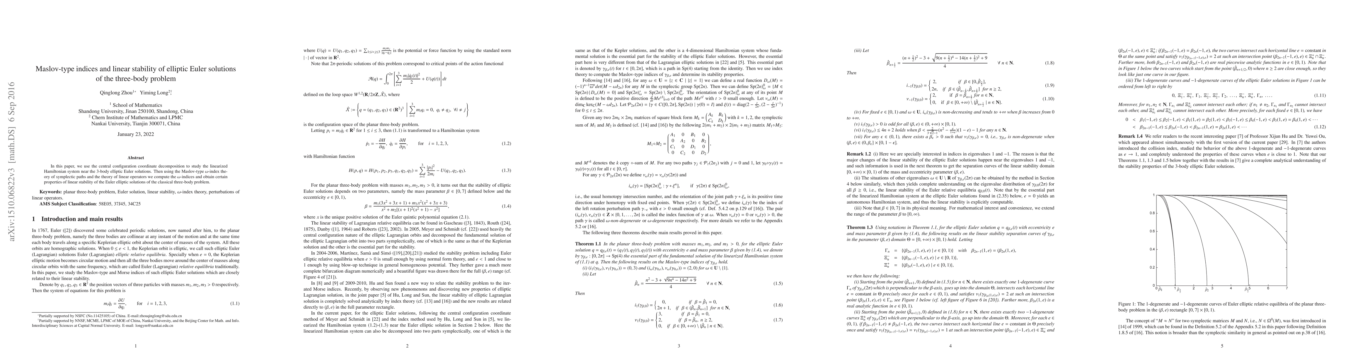 In this paper, we use the central configuration coordinate decomposition to study the linearized Hamiltonian system near the elliptic Euler solutions. Then using the Maslov-type \omega-index theory of symplectic paths and the theory of linear operators we compute the \omega-indices and obtain certain properties of linear stability of the Euler elliptic solutions of the classical three-body problem.