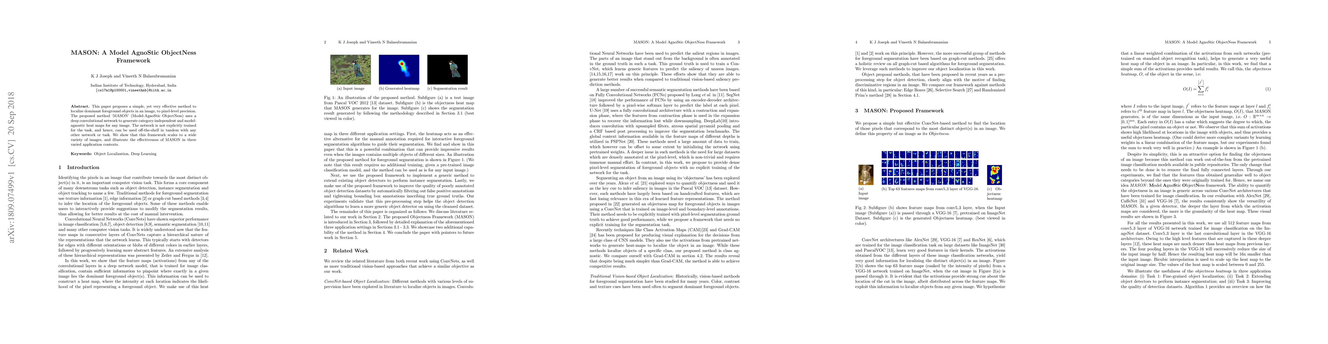 This paper introduces MASON, a model-agnostic objectness framework that uses deep convolutional networks to generate heat maps for dominant foreground objects in images at pixel-level precision. The framework is effective across various image types and can be used off-the-shelf with other models.