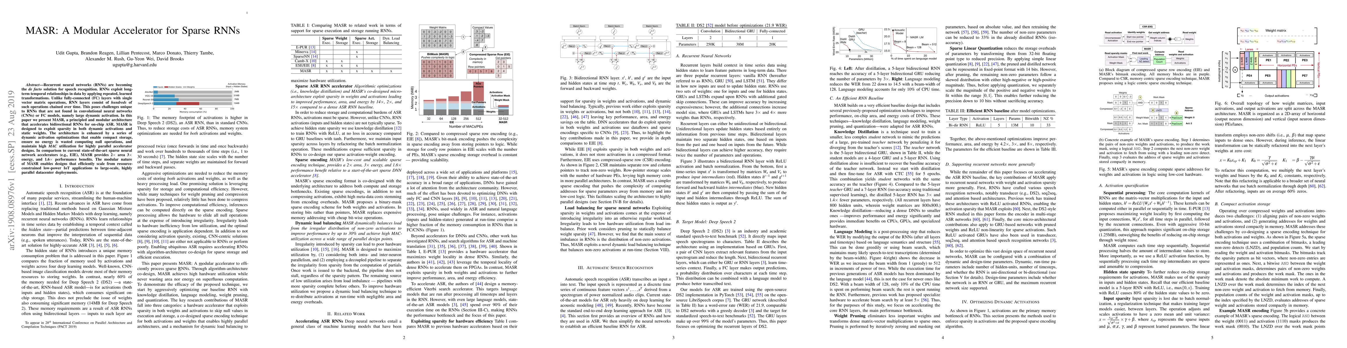 MASR is a modular accelerator designed to efficiently accelerate sparse bidirectional RNNs for on-chip speech recognition, leveraging sparsity in activations and weights to achieve significant area, energy, and performance improvements over existing accelerators. Its modular design allows it to scale from low-power IoT to large datacenter deployments.