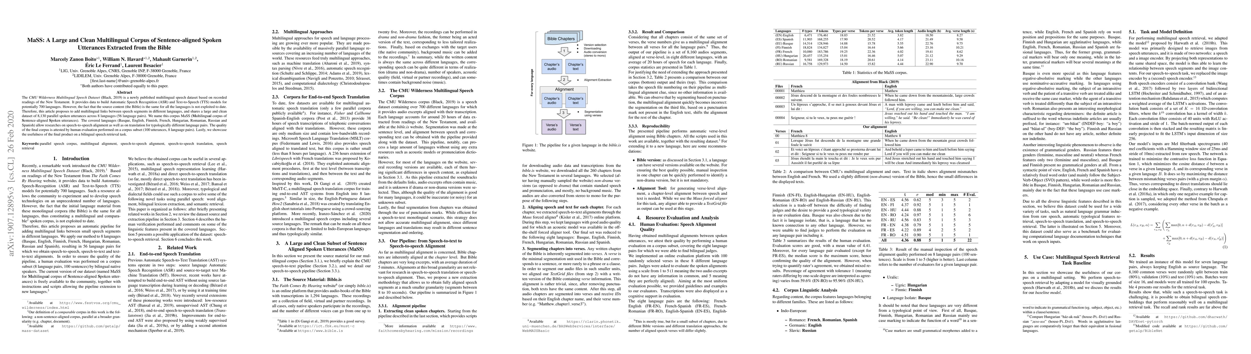 MaSS is a multilingual corpus of 8,130 parallel spoken utterances across 8 languages, designed to facilitate speech-to-speech alignment and translation research. It links speech segments in different languages, enhancing the CMU Wilderness Multilingual Speech Dataset by exploiting the shared Bible content.