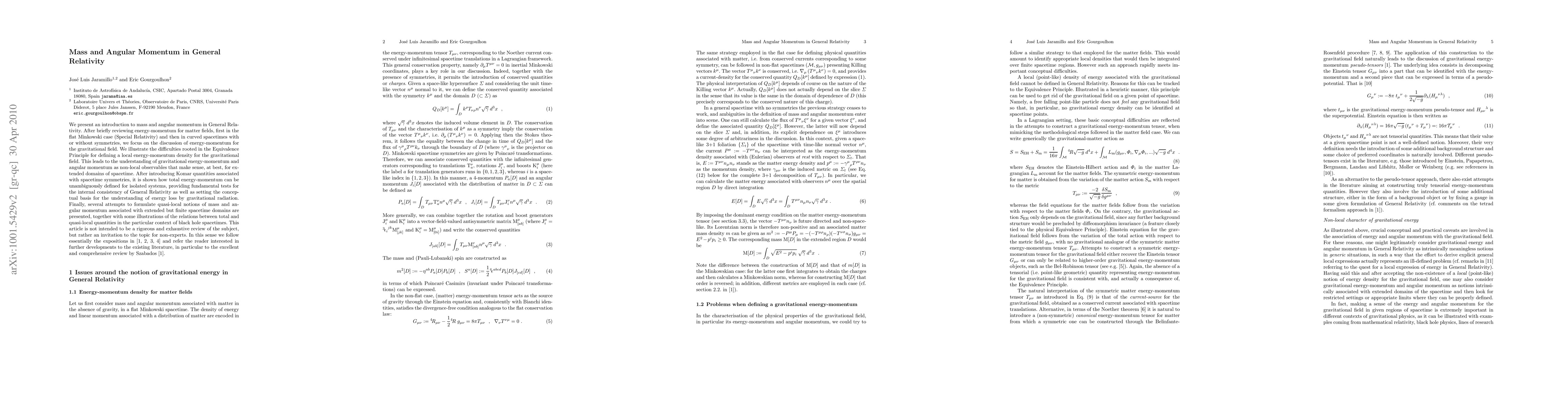 This paper introduces mass and angular momentum concepts in General Relativity, discussing the challenges of defining local energy-momentum for the gravitational field and presenting Komar quantities for total energy-momentum in isolated systems. It also explores quasi-local notions and their relevance to black hole spacetimes.