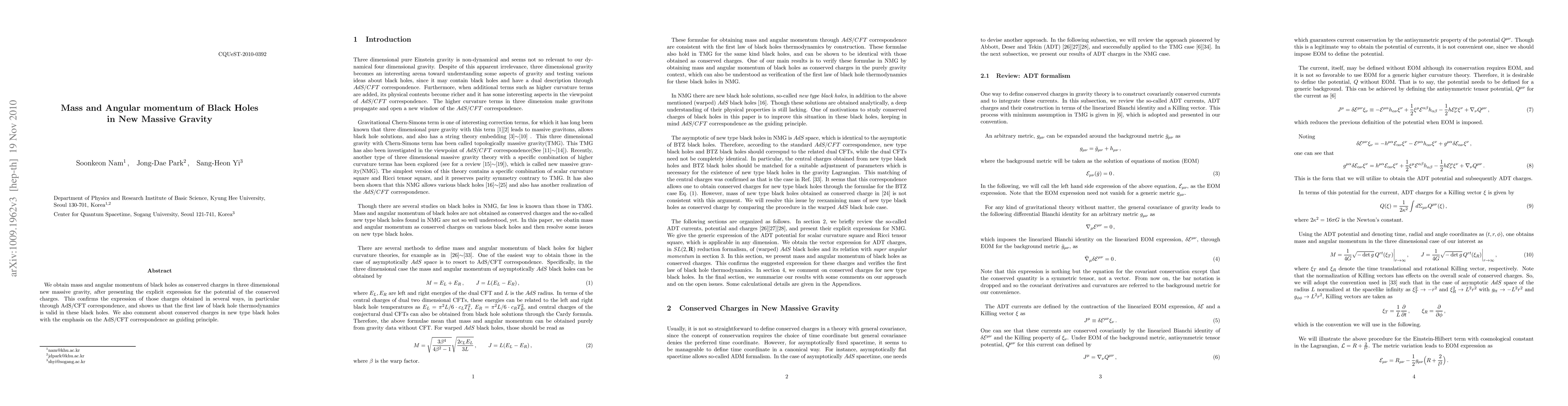 This paper calculates the mass and angular momentum of black holes in three-dimensional new massive gravity as conserved charges, confirming these expressions through AdS/CFT correspondence and demonstrating the validity of the first law of black hole thermodynamics. It also discusses the implications for new type black holes, emphasizing the role of AdS/CFT correspondence.
