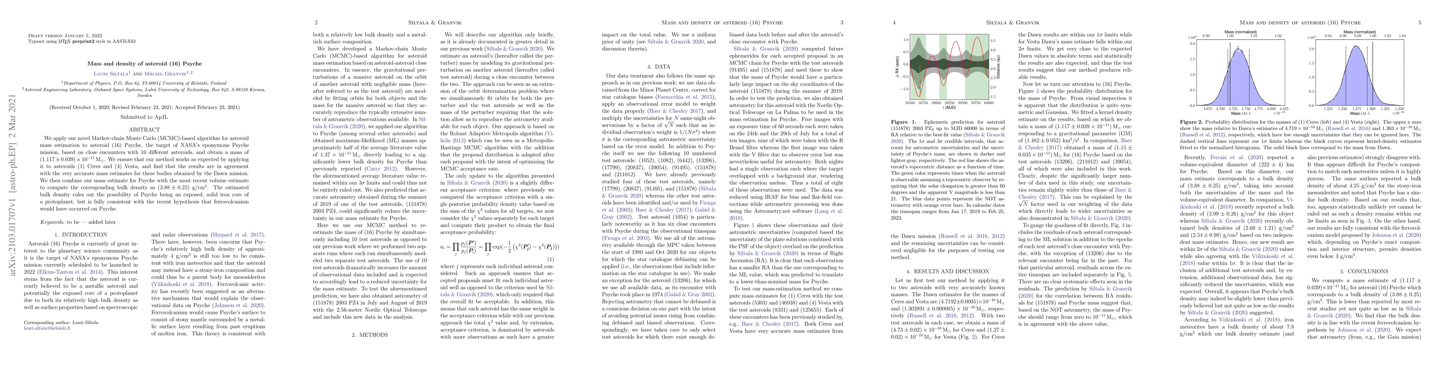 This study estimates the mass of asteroid (16) Psyche at $(1.117 \pm 0.039) \times 10^{-11}$ solar masses using a novel MCMC algorithm, and computes its bulk density as $(3.88 \pm 0.25)$ g/cm$^3$, supporting the hypothesis of ferrovolcanism rather than an exposed iron core.