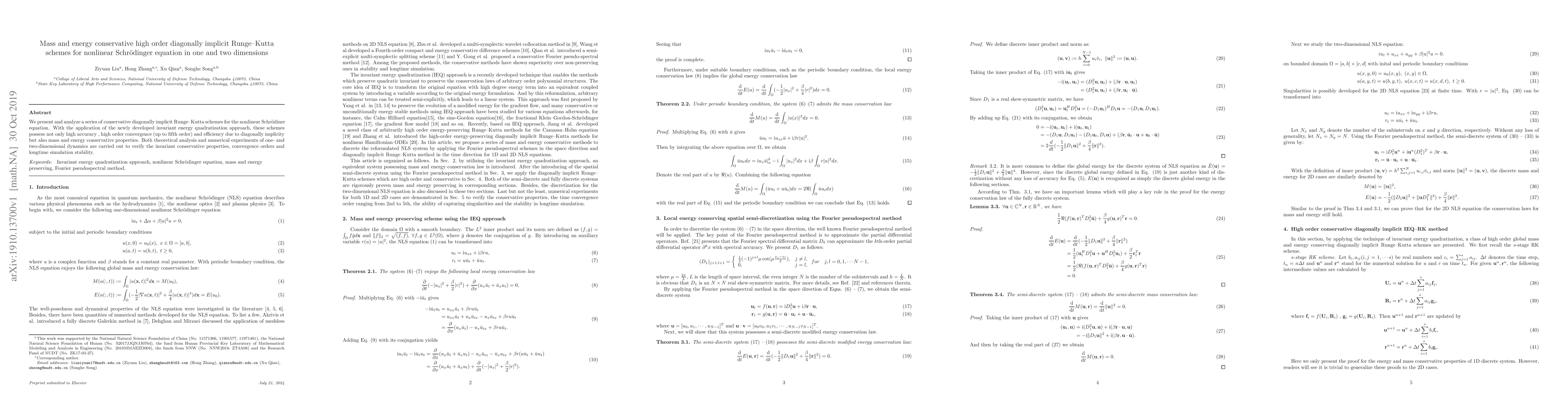 This paper introduces high-order diagonally implicit Runge-Kutta schemes for solving the nonlinear Schrödinger equation, ensuring mass and energy conservation through an invariant energy quadratization approach. Theoretical analysis and numerical experiments confirm their high accuracy, convergence up to fifth order, and long-time stability.