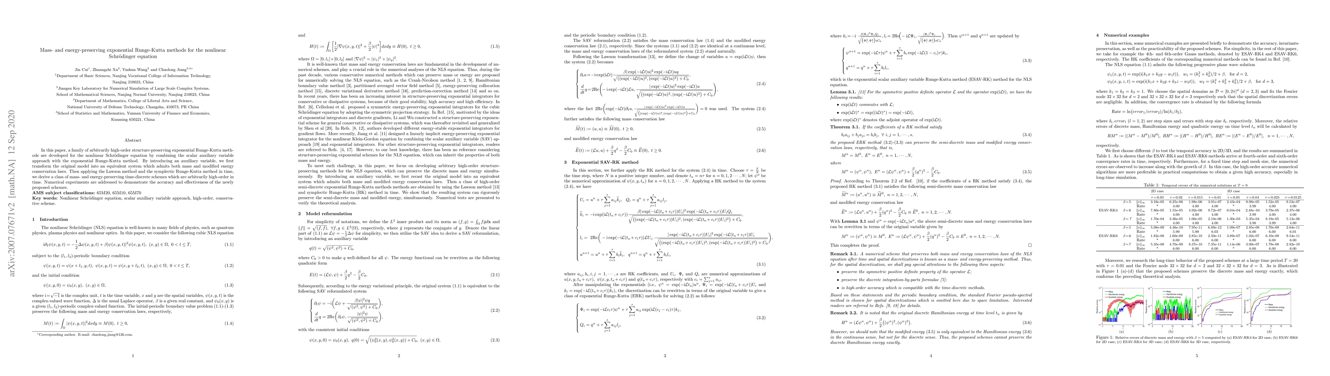 This paper develops high-order mass- and energy-preserving exponential Runge-Kutta methods for the nonlinear Schrödinger equation by transforming it into an equivalent system using a scalar auxiliary variable. Numerical experiments validate the accuracy and effectiveness of the proposed schemes.