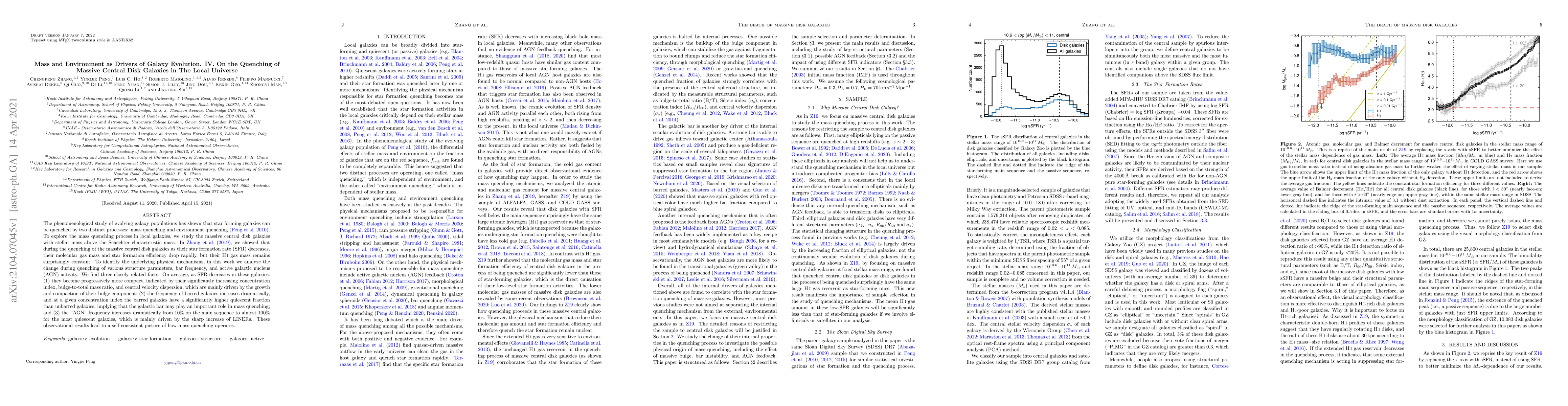 The phenomenological study of evolving galaxy populations has shown that star forming galaxies can be quenched by two distinct processes: mass quenching and environment quenching (Peng et al. 2010). To explore the mass quenching process in local galaxies, we study the massive central disk galaxies with stellar mass above the Schechter characteristic mass. In Zhang et al. (2019), we showed that during the quenching of the massive central disk galaxies as their star formation rate (SFR) decreases, their molecular gas mass and star formation efficiency drop rapidly, but their HI gas mass remains surprisingly constant. To identify the underlying physical mechanisms, in this work we analyze the change during quenching of various structure parameters, bar frequency, and active galactic nucleus (AGN) activity. We find three closely related facts. On average, as SFR decreases in these galaxies: (1) they become progressively more compact, indicated by their significantly increasing concentration index, bulge-to-total mass ratio, and central velocity dispersion, which are mainly driven by the growth and compaction of their bulge component; (2) the frequency of barred galaxies increases dramatically, and at a given concentration index the barred galaxies have a significantly higher quiescent fraction than unbarred galaxies, implying that the galactic bar may play an important role in mass quenching; and (3) the "AGN" frequency increases dramatically from 10% on the main sequence to almost 100% for the most quiescent galaxies, which is mainly driven by the sharp increase of LINERs. These observational results lead to a self-consistent picture of how mass quenching operates.