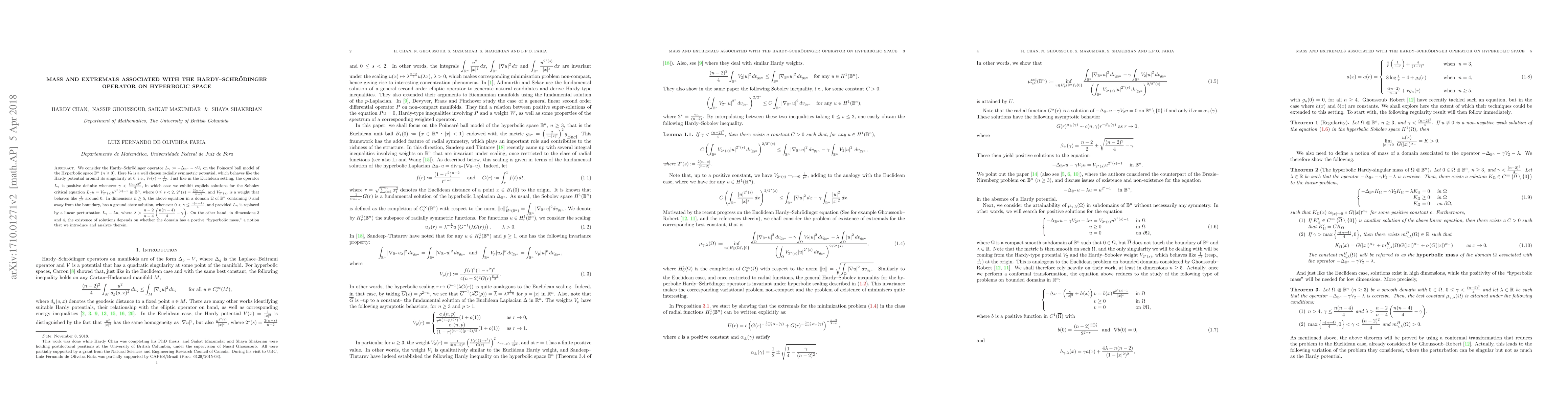 We consider the Hardy-Schr\"odinger operator $ -\Delta_{\mathbb{B}^n}-\gamma{V_2}$ on the Poincar\'e ball model of the Hyperbolic space ${\mathbb{B}^n}$ ($n \geq 3$). Here $V_2$ is a well chosen radially symmetric potential, which behaves like the Hardy potential around its singularity at $0$, i.e., $V_2(r)\sim \frac{1}{r^2}$. Just like in the Euclidean setting, the operator $ -\Delta_{\mathbb{B}^n}-\gamma{V_2}$ is positive definite whenever $\gamma <\frac{(n-2)^2}{4}$, in which case we exhibit explicit solutions for the equation $$-\Delta_{\mathbb{B}^n}u-\gamma{V_2}u=V_{2^*(s)}u^{2^*(s)-1}\quad{\text{ in }}\mathbb{B}^n,$$ where $0\leq s <2$, $2^*(s)=\frac{2(n-s)}{n-2}$, and $V_{2^*(s)}$ is a weight that behaves like $\frac{1}{r^s}$ around $0$. The same equation, on bounded domains $\Omega$ of ${\mathbb{B}^n}$ containing $0$ but not touching the hyperbolic boundary, has positive solutions if $0 < \gamma \leq \frac{(n-2)^{2}}{4}-\frac{1}{4}$. However, if $\frac{(n-2)^{2}}{4}-\frac{1}{4}< \gamma < \frac{(n-2)^{2}}{4}$, the existence of solutions requires the positivity of the "hyperbolic Hardy mass" $m_{_{\mathbb{B}^n}}(\Omega)$ of the domain, a notion that we introduce and analyse therein.