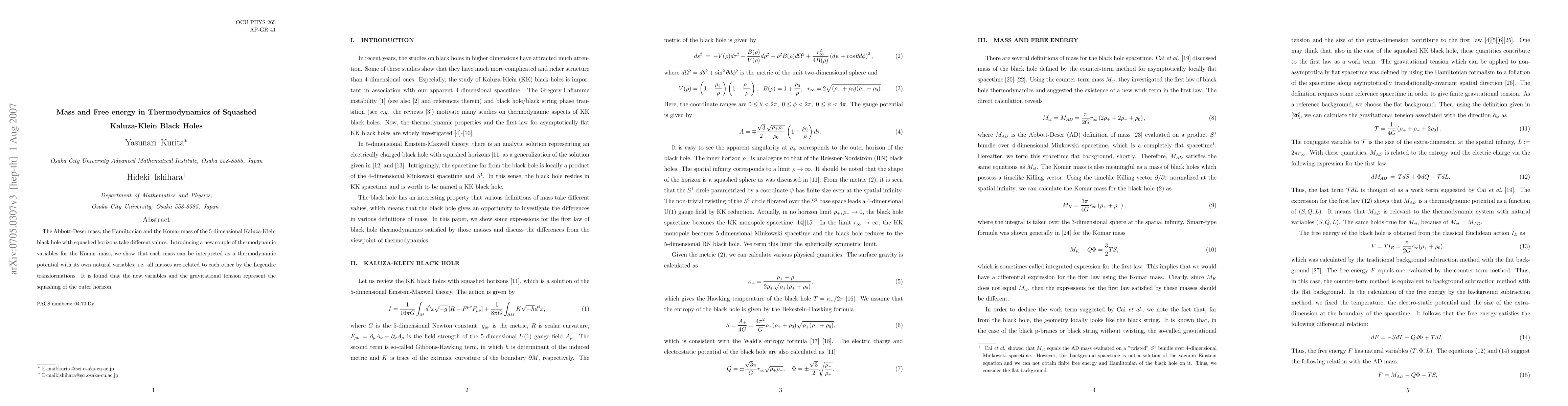 The Abbott-Deser mass, the Hamiltonian and the Komar mass of the 5-dimensional Kaluza-Klein black hole with squashed horizons take different values. Introducing a new couple of thermodynamic variables for the Komar mass, we show that each mass can be interpreted as a thermodynamic potential with its own natural variables, i.e. all masses are related to each other by the Legendre transformations. It is found that the new variables and the gravitational tension represent the squashing of the outer horizon.