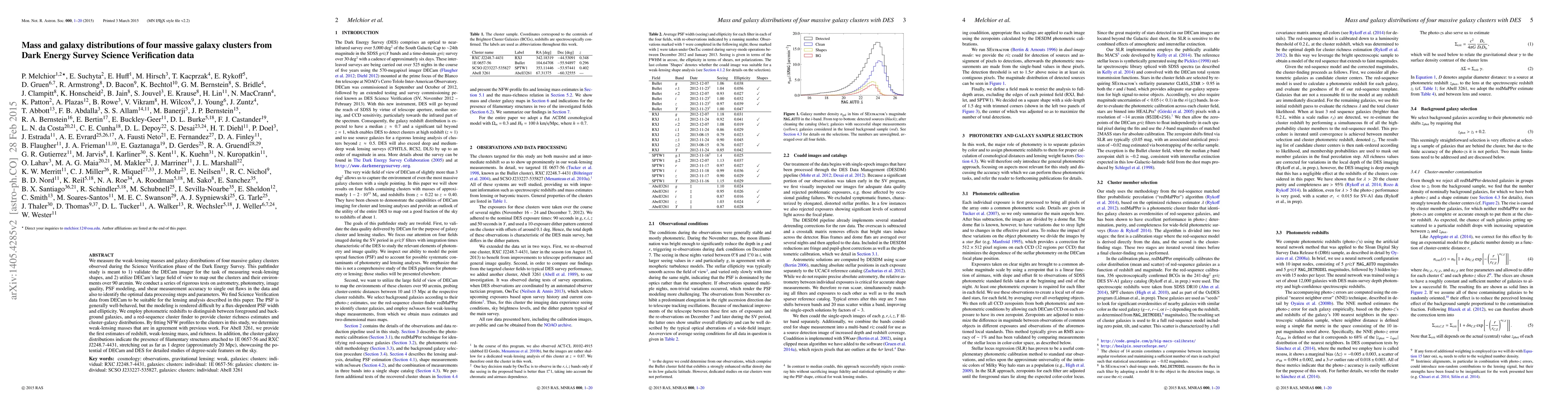 This study measures the weak-lensing masses and galaxy distributions of four massive galaxy clusters using Dark Energy Survey Science Verification data, validating the DECam imager and mapping clusters over 90 arcmin. The analysis reveals the presence of filamentary structures in two clusters, demonstrating the potential for detailed studies of large-scale cosmic features.