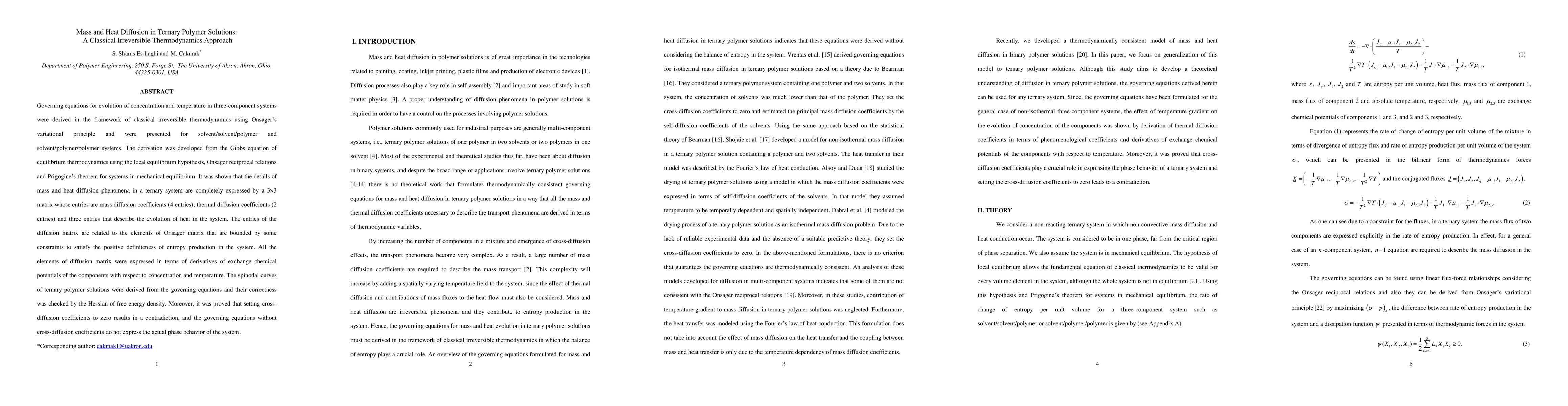 This paper derives governing equations for concentration and temperature evolution in ternary polymer solutions using classical irreversible thermodynamics. It establishes a 3x3 diffusion matrix to describe mass and heat diffusion, with elements derived from chemical potentials, and shows the necessity of cross-diffusion coefficients for accurate phase behavior representation.