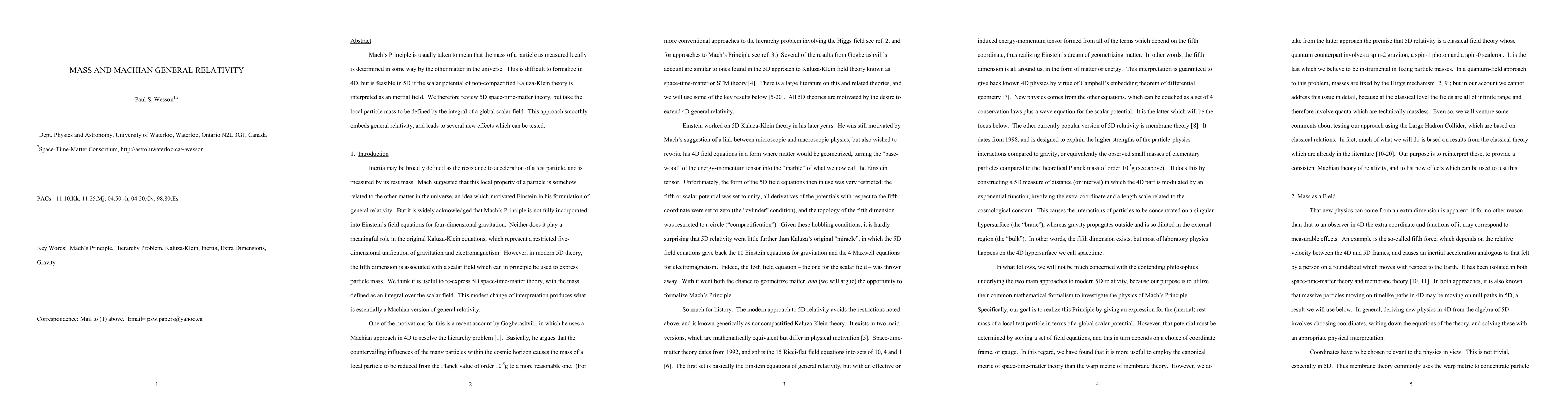 Mach's Principle is usually taken to mean that the mass of a particle as measured locally is determined in some way by the other matter in the universe. This is difficult to formalize in 4D,but is feasible in 5D if the scalar potential of non-compactified Kaluza-Klein theory is interpreted as an inertial field. We therefore review 5D space-time-matter theory, but take the local particle mass to be defined by the integral of a global scalar field. This approach smoothly embeds general relativity, and leads to several new effects which can be tested.