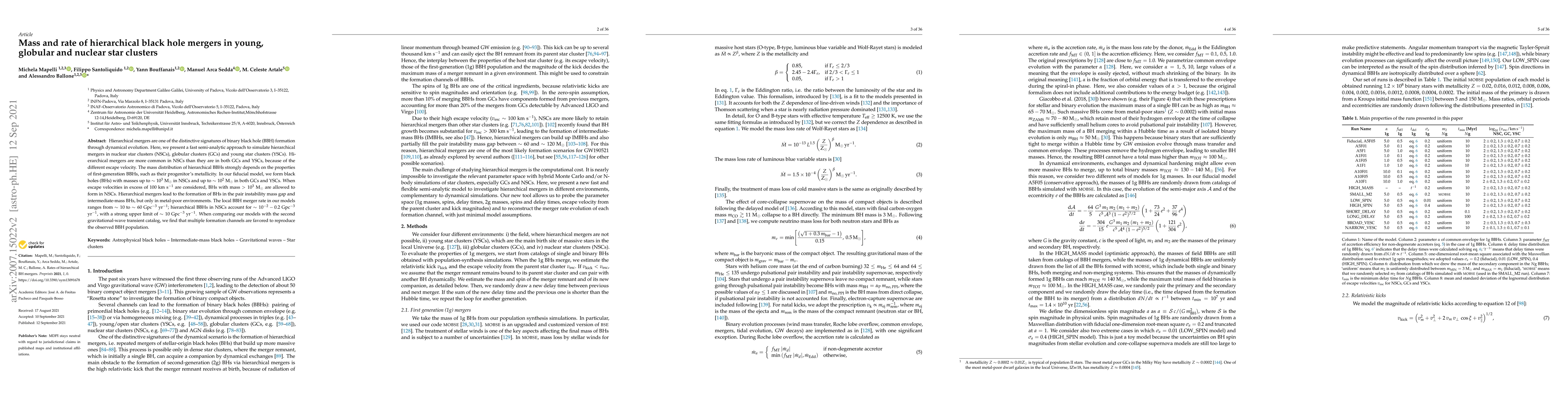 Hierarchical mergers are one of the distinctive signatures of binary black hole (BBH) formation through dynamical evolution. Here, we present a fast semi-analytic approach to simulate hierarchical mergers in nuclear star clusters (NSCs), globular clusters (GCs) and young star clusters (YSCs). Hierarchical mergers are more common in NSCs than they are in both GCs and YSCs, because of the different escape velocity. The mass distribution of hierarchical BBHs strongly depends on the properties of first-generation BBHs, such as their progenitor's metallicity. In our fiducial model, we form black holes (BHs) with masses up to $\sim{}10^3$ M$_\odot$ in NSCs and up to $\sim{}10^2$ M$_\odot$ in both GCs and YSCs. When escape velocities in excess of 100 km~s$^{-1}$ are considered, BHs with mass $>10^3$ M$_\odot$ are allowed to form in NSCs. Hierarchical mergers lead to the formation of BHs in the pair instability mass gap and intermediate-mass BHs, but only in metal-poor environments. The local BBH merger rate in our models ranges from $\sim{}10$ to $\sim{} 60$ Gpc$^{-3}$ yr$^{-1}$; hierarchical BBHs in NSCs account for $\sim{}10^{-2}- 0.2$ Gpc$^{-3}$ yr$^{-1}$, with a strong upper limit of $\sim{}10$ Gpc$^{-3}$ yr$^{-1}$. When comparing our models with the second gravitational-wave transient catalog, we find that multiple formation channels are favored to reproduce the observed BBH population.