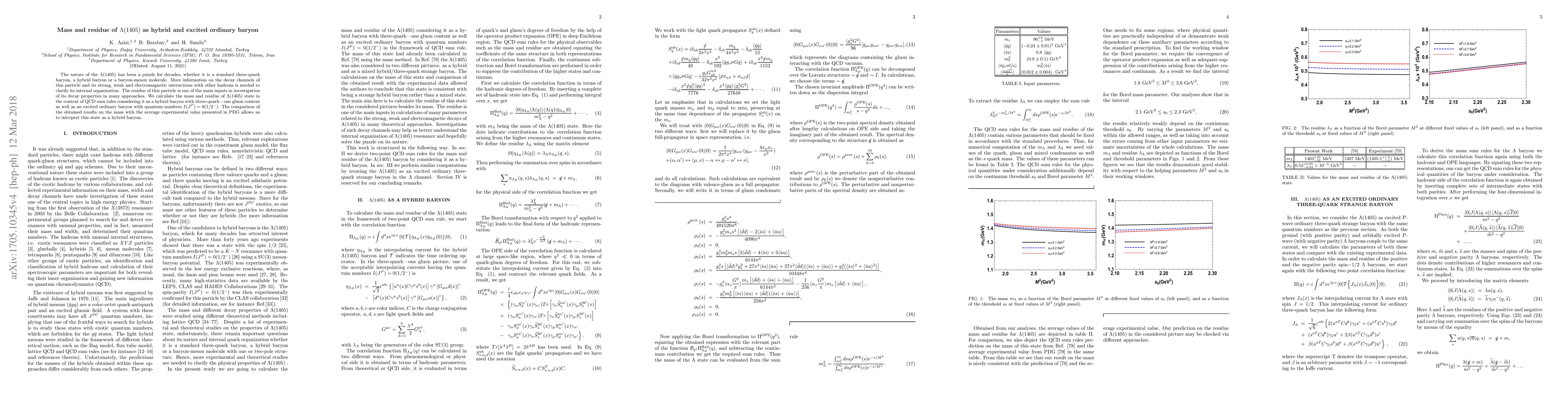 The nature of the $ \Lambda(1405) $ has been a puzzle for decades, whether it is a standard three-quark baryon, a hybrid baryon or a baryon-meson molecule. More information on the decay channels of this particle and its strong, weak and electromagnetic interactions with other hadrons is needed to clarify its internal organization. The residue of this particle is one of the main inputs in investigation of its decay properties in many approaches. We calculate the mass and residue of $\Lambda(1405)$ state in the context of QCD sum rules considering it as a hybrid baryon with three-quark---one gluon content as well as an excited ordinary baryon with quantum numbers $I(J^{P})=0(1/2^{-})$. The comparison of the obtained results on the mass with the average experimental value presented in PDG allows us to interpret this state as a hybrid baryon.