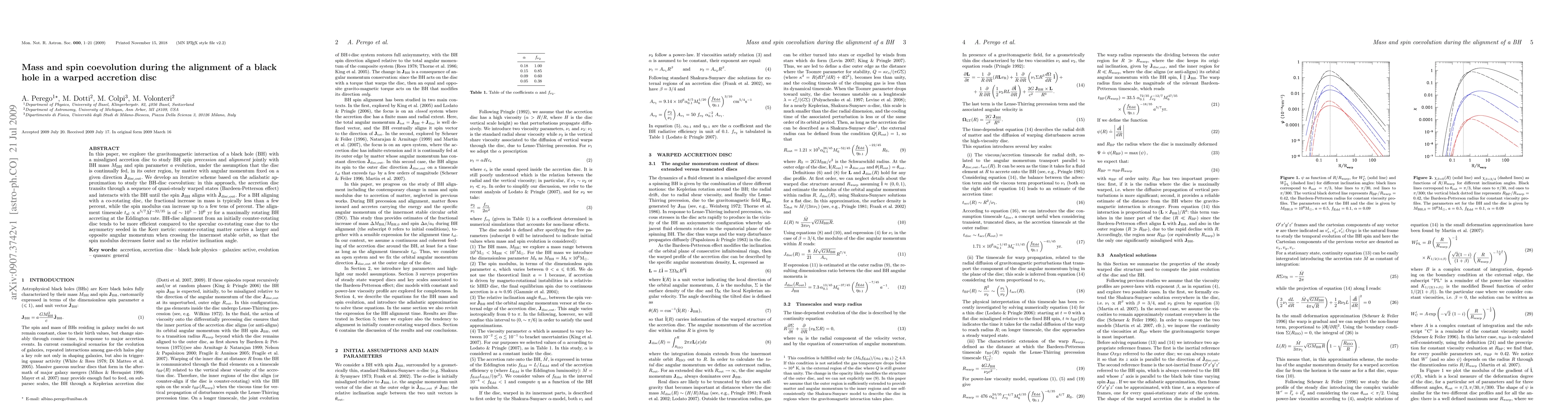 In this paper, we explore the gravitomagnetic interaction of a black hole (BH) with a misaligned accretion disc to study BH spin precession and alignment jointly with BH mass and spin parameter evolution, under the assumption that the disc is continually fed, in its outer region, by matter with angular momentum fixed on a given direction. We develop an iterative scheme based on the adiabatic approximation to study the BH-disc coevolution: in this approach, the accretion disc transits through a sequence of quasi-steady warped states (Bardeen-Petterson effect) and interacts with the BH until the BH spin aligns with the outer angular momentum direction. For a BH aligning with a co-rotating disc, the fractional increase in mass is typically less than a few percent, while the spin modulus can increase up to a few tens of percent. The alignment timescale is between ~ 100 thousands and ~ 1 millions years for a maximally rotating BH accreting at the Eddington rate. BH-disc alignment from an initially counter-rotating disc tends to be more efficient compared to the specular co-rotating case due to the asymmetry seeded in the Kerr metric: counter-rotating matter carries a larger and opposite angular momentum when crossing the innermost stable orbit, so that the spin modulus decreases faster and so the relative inclination angle.