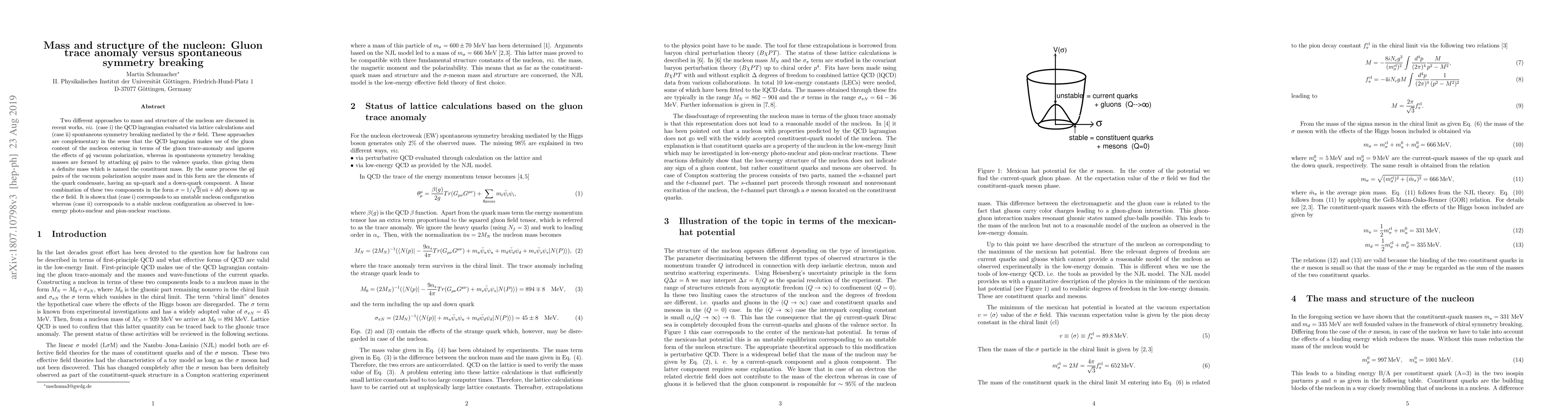 Two different approaches to mass and structure of the nucleon are discussed in recent works, ${\it viz.}$ (case 1) the QCD lagrangian evaluated via lattice calculations and (case ii) spontaneous symmetry breaking mediated by the $\sigma$ field. These approaches are complementary in the sense that the QCD lagrangian makes use of the gluon content of the nucleon entering in terms of the gluon trace-anomaly and ignores the effects of $q{\bar q}$ vacuum polarization, whereas in spontaneous symmetry breaking masses are formed by attaching $q{\bar q}$ pairs to the valence quarks, thus giving them a definite mass which is named the constituent mass. By the same process the $q{\bar q}$ pairs of the vacuum polarization acquire mass and in this form are the elements of the quark condensate, having an up-quark and a down-quark component. A linear combination of these two components in the form $\sigma=1/\sqrt{2}(u{\bar u} + d{\bar d})$ shows up as the $\sigma$ field. It is shown that (case i) corresponds to an unstable nucleon configuration whereas (case ii) corresponds to a stable nucleon configuration as observed in low-energy photo-nuclear and pion-nuclear reactions.