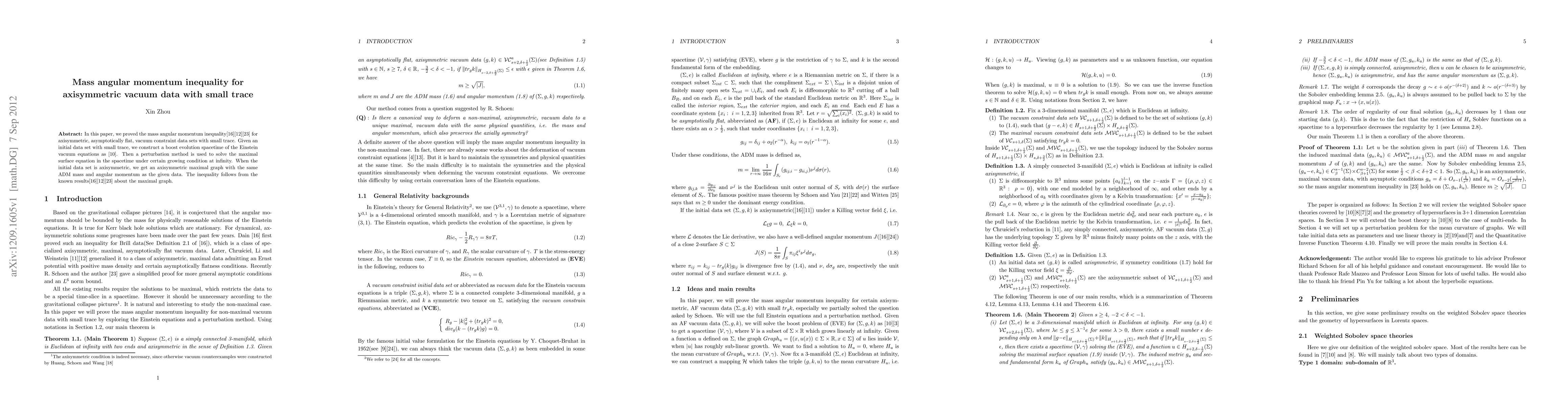 In this paper, we proved the mass angular momentum inequality\cite{D1}\cite{ChrusLiWe}\cite{SZ} for axisymmetric, asymptotically flat, vacuum constraint data sets with small trace. Given an initial data set with small trace, we construct a boost evolution spacetime of the Einstein vacuum equations as \cite{ChOM}. Then a perturbation method is used to solve the maximal surface equation in the spacetime under certain growing condition at infinity. When the initial data set is axisymmetric, we get an axisymmetric maximal graph with the same ADM mass and angular momentum as the given data. The inequality follows from the known results\cite{D1}\cite{ChrusLiWe}\cite{SZ} about the maximal graph.