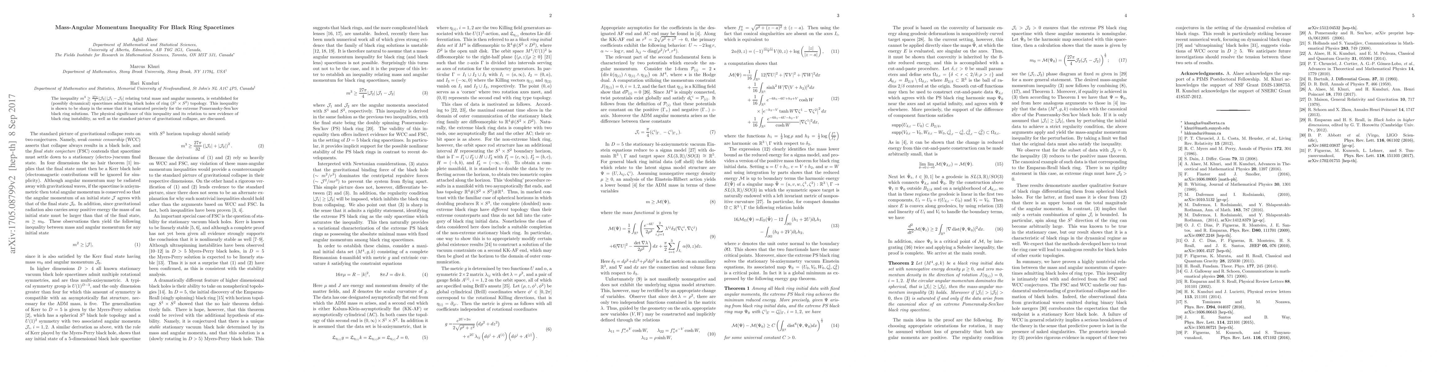 The paper establishes a mass-angular momentum inequality for black ring spacetimes, showing it is precisely satisfied by extreme Pomeransky-Sen'kov black rings, and discusses its implications for black ring instability and gravitational collapse.