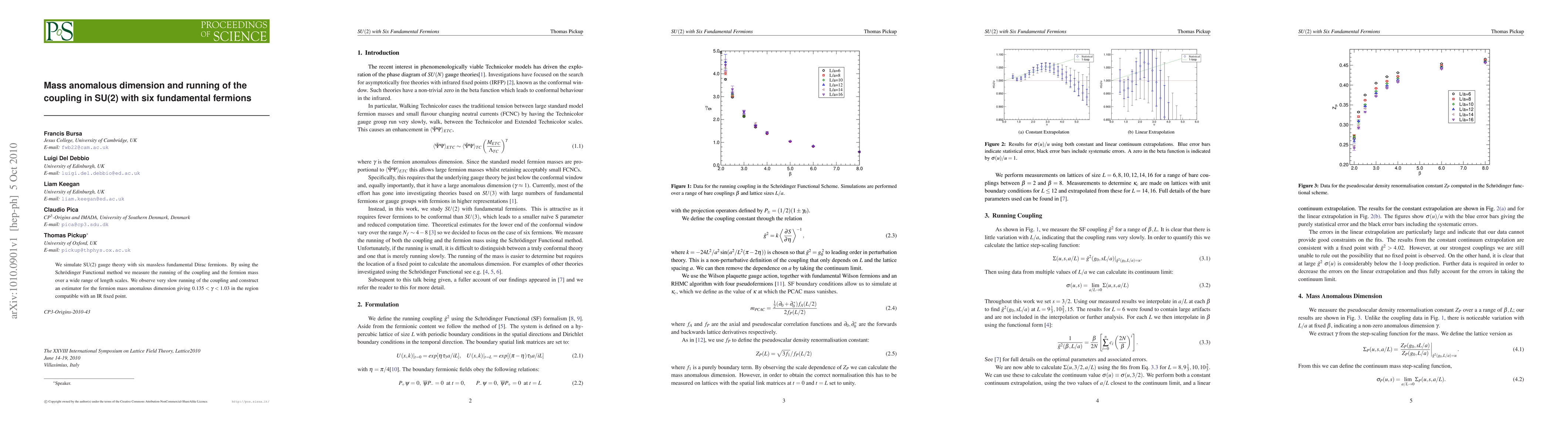 This paper simulates SU(2) gauge theory with six massless fermions to measure coupling and fermion mass running over a range of length scales, finding slow coupling running and an estimate for the fermion mass anomalous dimension between 0.135 and 1.03.