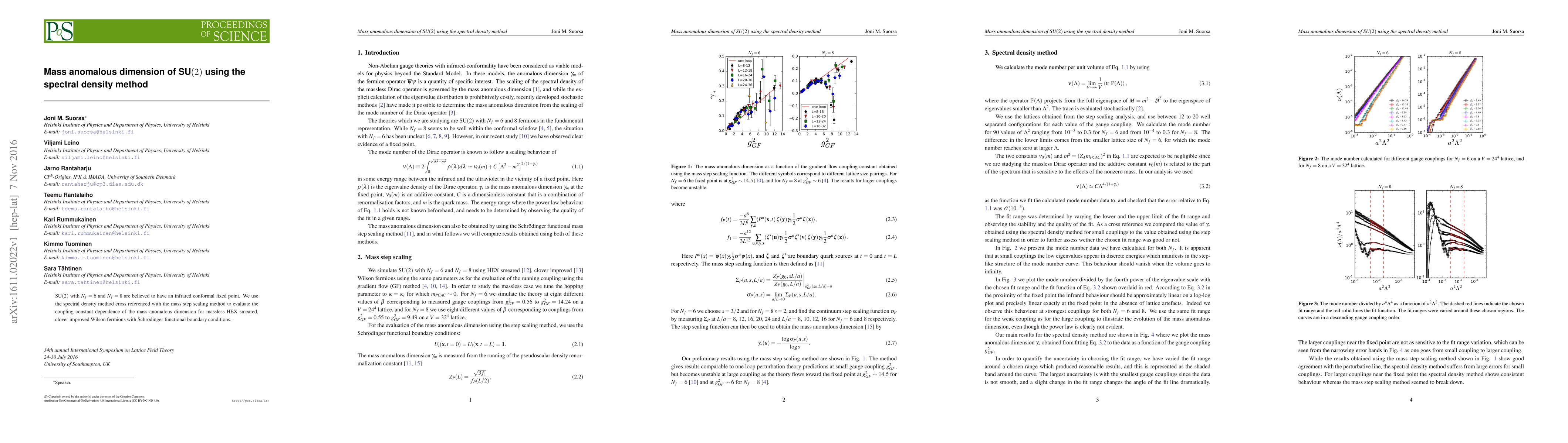 SU(2) with N_f = 6 and N_f = 8 are believed to have an infrared conformal fixed point. We use the spectral density method cross referenced with the mass step scaling method to evaluate the coupling constant dependence of the mass anomalous dimension for massless HEX smeared, clover improved Wilson fermions with Schr\"odinger functional boundary conditions.