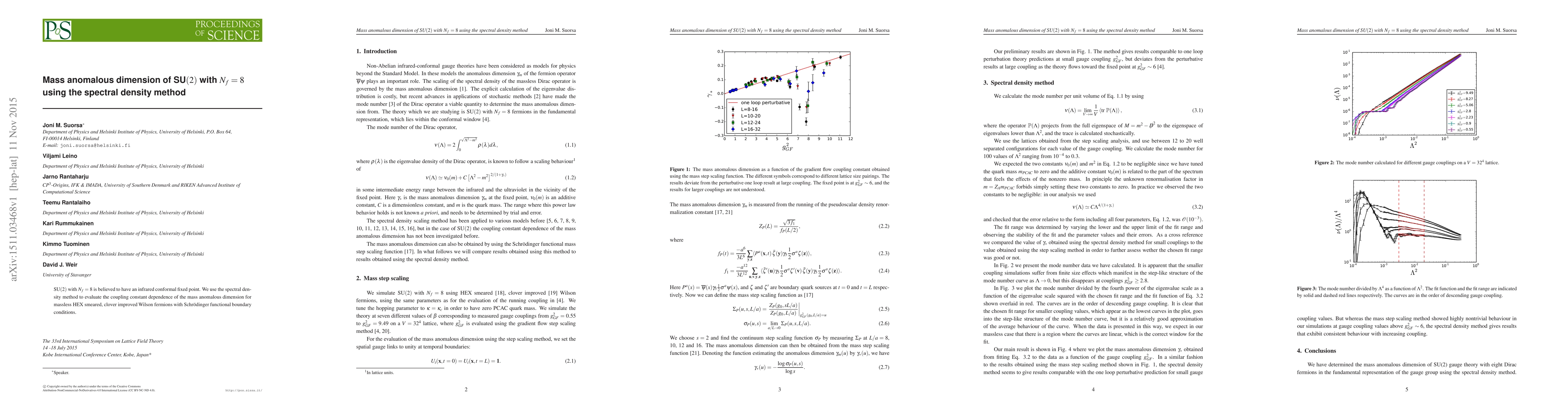 Summary: This paper evaluates the mass anomalous dimension for SU(2) with Nf=8 using the spectral density method, focusing on the coupling constant dependence for massless fermions, suggesting the presence of an infrared conformal fixed point.