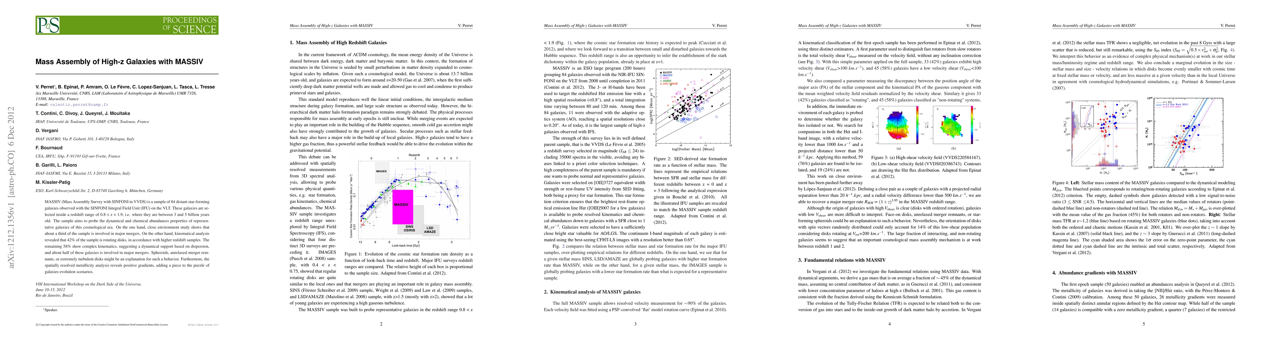MASSIV (Mass Assembly Survey with SINFONI in VVDS) is a sample of 84 distant star-forming galaxies observed with the SINFONI Integral Field Unit (IFU) on the VLT. These galaxies are selected inside a redshift range of 0.8 < z < 1.9, i.e. where they are between 3 and 5 billion years old. The sample aims to probe the dynamical and chemical abundances properties of representative galaxies of this cosmological era. On the one hand, close environment study shows that about a third of the sample is involved in major mergers. On the other hand, kinematical analysis revealed that 42% of the sample is rotating disks, in accordance with higher redshift samples. The remaining 58% show complex kinematics, suggesting a dynamical support based on dispersion, and about half of these galaxies is involved in major mergers. Spheroids, unrelaxed merger remnants, or extremely turbulent disks might be an explanation for such a behavior. Furthermore, the spatially resolved metallicity analysis reveals positive gradients, adding a piece to the puzzle of galaxies evolution scenarios.