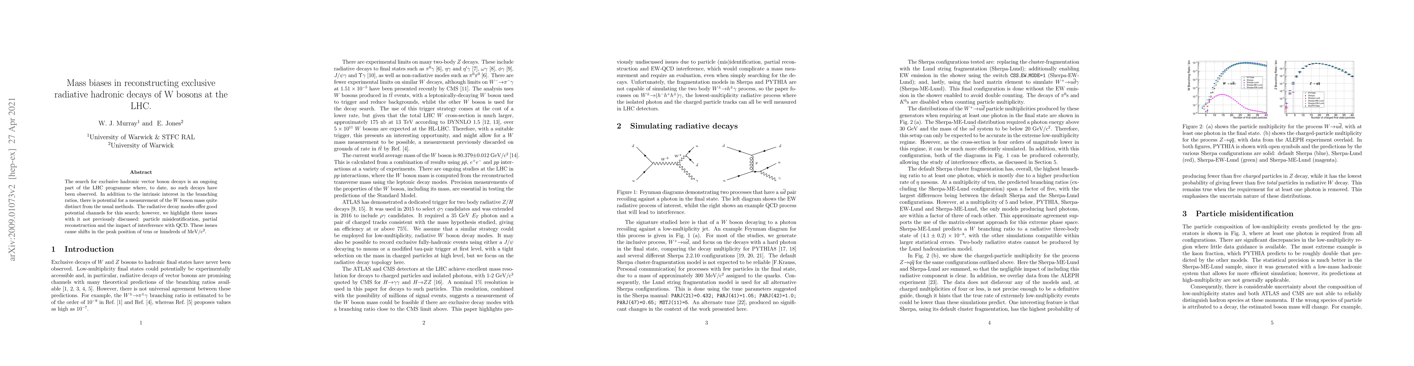 The search for exclusive hadronic vector boson decays is an ongoing part of the LHC programme where, to date, no such decays have been observed. In addition to the intrinsic interest in the branching ratios, there is potential for a measurement of the $W$ boson mass quite distinct from the usual methods. The radiative decay modes offer good potential channels for this search; however, we highlight three issues with it not previously discussed: particle misidentification, partial reconstruction and the impact of interference with QCD. These issues cause shifts in the peak position of tens or hundreds of MeV/c$^2$.
