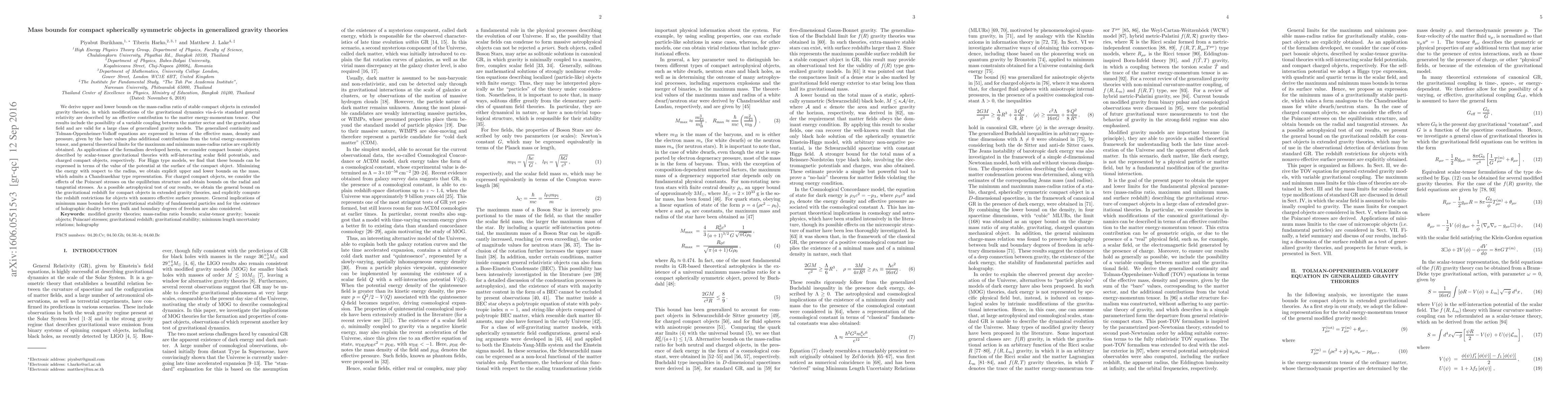 We derive upper and lower bounds on the mass-radius ratio of stable compact objects in extended gravity theories, in which modifications of the gravitational dynamics via-{\' a}-vis standard general relativity are described by an effective contribution to the matter energy-momentum tensor. Our results include the possibility of a variable coupling between the matter sector and the gravitational field and are valid for a large class of generalized gravity models. The generalized continuity and Tolman-Oppenheimer-Volkoff equations are expressed in terms of the effective mass, density and pressure, given by the bare values plus additional contributions from the total energy-momentum tensor, and general theoretical limits for the maximum and minimum mass-radius ratios are explicitly obtained. As an applications of the formalism developed herein, we consider compact bosonic objects, described by scalar-tensor gravitational theories with self-interacting scalar field potentials, and charged compact objects, respectively. For Higgs type models, we find that these bounds can be expressed in terms of the value of the potential at the surface of the compact object. Minimizing the energy with respect to the radius, we obtain explicit upper and lower bounds on the mass, which admits a Chandrasekhar type representation. For charged compact objects, we consider the effects of the Poincar\'{e} stresses on the equilibrium structure and obtain bounds on the radial and tangential stresses. As a possible astrophysical test of our results, we obtain the general bound on the gravitational redshift for compact objects in extended gravity theories. General implications of minimum mass bounds for the gravitational stability of fundamental particles and for the existence of holographic duality between bulk and boundary degrees of freedom are also considered.