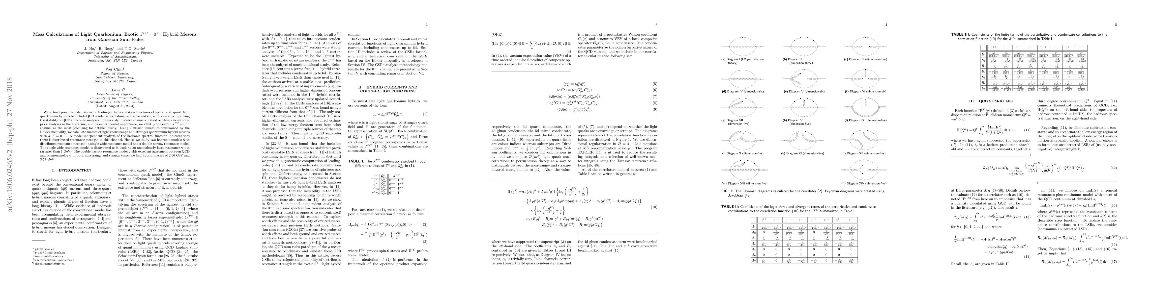 We extend previous calculations of leading-order correlation functions of spin-0 and spin-1 light quarkonium hybrids to include QCD condensates of dimensions five and six, with a view to improving the stability of QCD sum-rules analyses in previously unstable channels. Based on these calculations, prior analyses in the literature, and its phenomenological importance, we identify the exotic $J^{PC}=0^{+-}$ channel as the most promising for detailed study. Using Gaussian sum-rules constrained by the H\"older inequality, we calculate masses of light (nonstrange and strange) quarkonium hybrid mesons with $J^{PC}=0^{+-}$. We consider single narrow, single wide, and double narrow resonance models, and find that the double narrow resonance model yields the best agreement between QCD and phenomenology. In both non-strange and strange cases, we find hybrid masses of $2.60$ GeV and $3.57$ GeV.